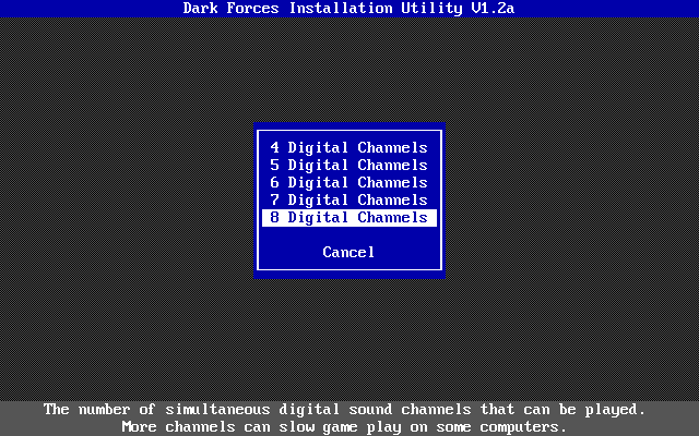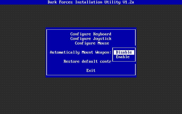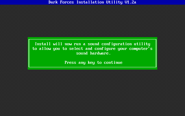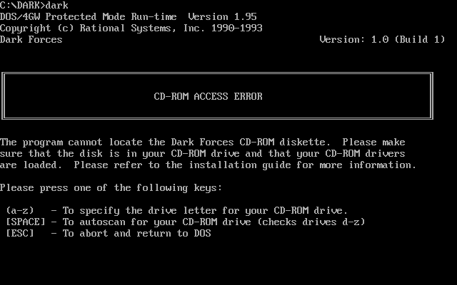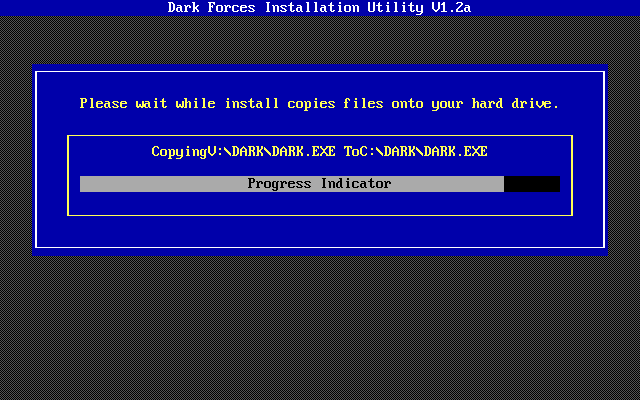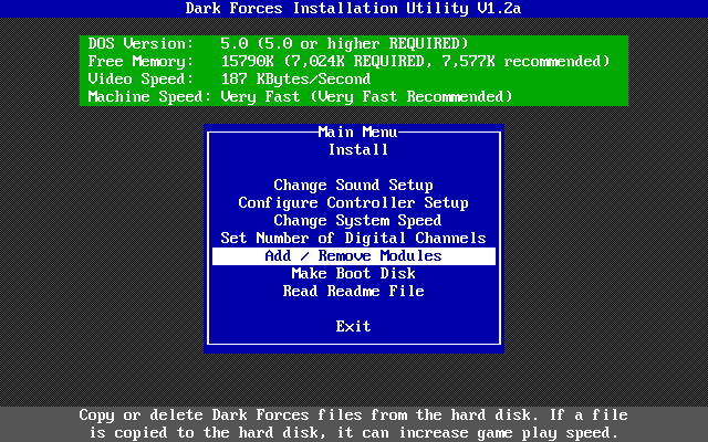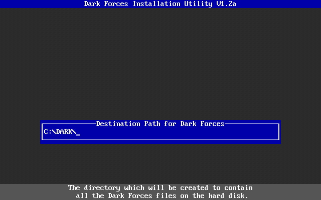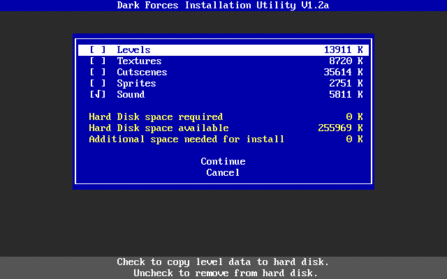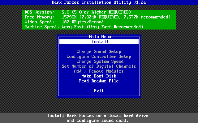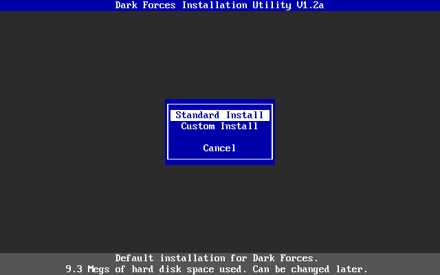 Dark Forces must be installed to your hard disk, though the INSTALL utility allows you to choose a custom installation where you can choose the modules to install to hard disk. Those that are not installed will require the CD-ROM to be present as you play the game.