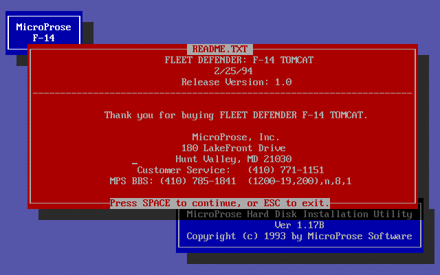 1.2 | 6 May 1994 | (Note: There was no v1.1). v1.2 introduced many fixes over the initial 1.0 release. Heading drift fixed, Enemy chutes fall slower, Other planes now leave the carrier at same speed the player plane does, Padlock jitters are gone, Afterburners on other planes will be on during proper conditions, Disabling training mode in Oceana no longer crashes your plane when you take off from carrier, Planes will not circle the first waypoint at the start of a mission unless told to, E key will work only if training mode is on or Easy Mode landing is on, Your wingman's lights will turn off when he is attacking, You will no longer padlock dead missiles, Button 4 (or 'K' key) will now break lock (previously this was the 'L' key), You can no longer raise your gear on the carrier deck, Gun difficulty has been increased on Authentic weapon setting, No crash log messages after you eject, Planes will take off when they should (no more meeting the 2nd half of a strike group leaving as you return), Helicopters will land on the carrier, Higher level enemies will use Allied strategies in knife fight, and stick around much longer, All wingmen in group will match leader's skill instead of being average, AIs can fire Phoenix missiles at same range we can, Explosions will take place on top of land, Carrier guns will not fire in "Opposites" training mission, Stategic Strike in Fighting Withdrawl has been fixed (what you were escorting didn't match what the mission was looking for. The other strategic strike missions are correct), The Rush Hour missions in El Dorado Canyon have been tweaked, Removed "bing-bongs" from buttons, Sped up debriefing; holding mouse on button now cycles the list, Fixed RIO/pilot wing reversals on edit pilot box, Medal of Honor will now appear in medals box, Adlib Gold digital wrapper sounds fixed, Added six missing planes to enemies list in scramble screen, Fly over option on missions ending in death has been removed from top two difficulty levels, Not enough memory error reporting more robust, Pilot rank properly updated in HOF, RIO rank now is the same as pilot rank everywhere, Mach indicator on the HSD has been fixed, Turning radar off will now break lock (closure and range data will not be displayed on the HUD), Fixed slight deviation problem with ball, Data Link ranges have been expanded, Addition of COCKPIT.GIF which labels the pilot's cockpit (to view use any GIF File viewer), F14 JUKEBOX has been added (to listen to FLEET DEFENDER's music goto the \MPS\F14 Directory and type "F14JUKE"). |