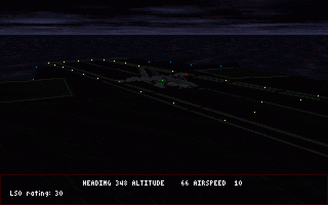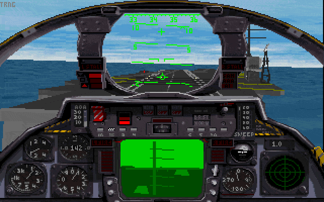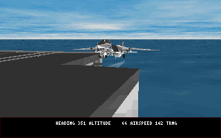 Fleet Defender took MicroProses's combat flight simulation history to the next level, with full access to both the pilot's seat and the navigator's seat in the F-14 Tomcat. In MicroProse's previous combat flight sims the maximum number of aircraft that could be active at any one time was 8. In Fleet Defender this was increased to 70, and all of those were active from the start of your mission! This lent itself greatly to the level of immersion in the sim, knowing that you weren't the only thing happening in the game world. Other planes take off around you, others are circling ready to land, and the enemy are also taking off coming toward you or flying a combat air patrol (CAP) around their area of operation. In addition, the game is able to have up to 60 ground targets, 40 paths, 85 waypoints and 130 actions active simultaneously.