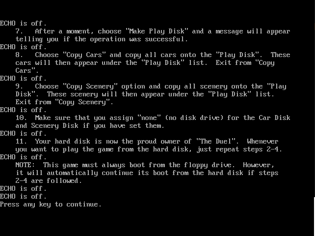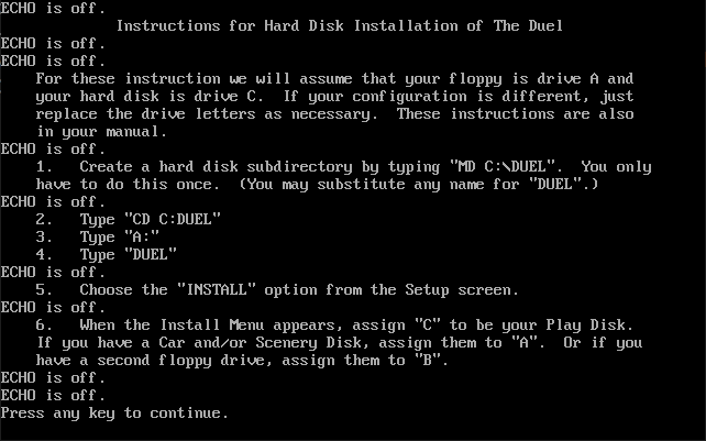 To install the game to your hard disk, insert Disk 1 and run INSTALL.BAT for instructions: