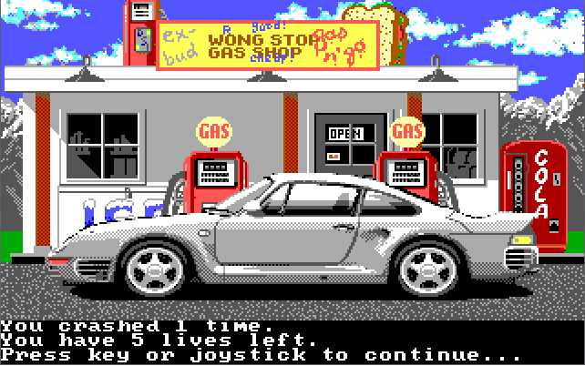 Could they have done more? Yes. Test Drive II still only supports 16-colour EGA graphics (320 x 200 resolution) and the PC speaker is all you get on the sound front. For 1989, this is woeful, and really detracts from the game. This year saw the release of games like Indianapolis 500: The Simulation, Prince of Persia, and Indiana Jones & the Last Crusade, all of which offered a 256-colour VGA version and sound options that included the Ad Lib card.