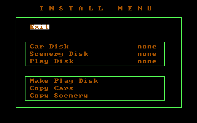 2) Navigate to the "INSTALL" icon in the lower right corner of the selection screen, and hit Enter:3) Insert your car disk or scenery disk into drive A: or B:.