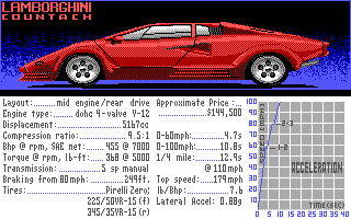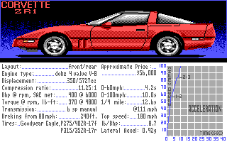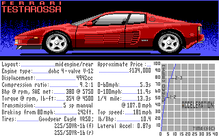 Also released alongside the game's launch was the first car expansion disk: Test Drive II: The Supercars. This added five news cars, many of which were present in the original Test Drive game: the RUF Twin Turbo, Lotus Turbo Esprit, Lamborghini Countach, Ferrari Testarossa, and the Chevrolet Corvette ZR1. Some of these you will no doubt recognize as being standard cars in the original Test Drive game. With these you could either drive one of these yourself, have your computer rival drive it, or both drive in the same make/model: