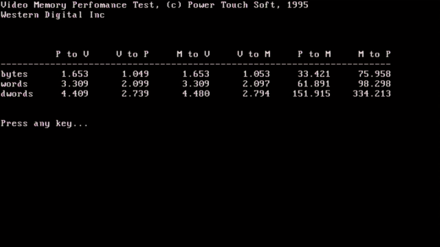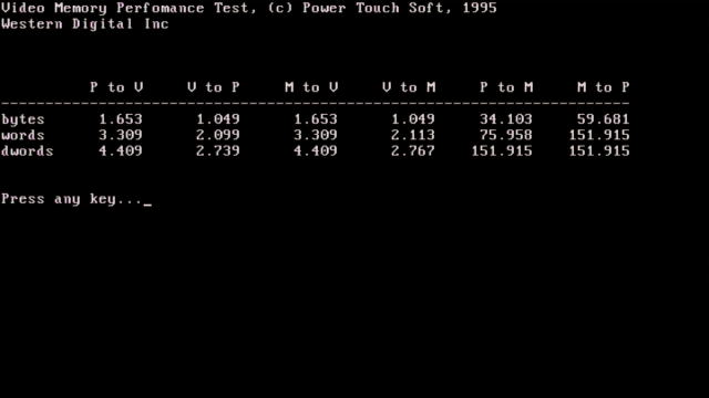 The WD90C24 features hardware Windows 2D acceleration with BitBlt and line draw functions, and a programmable 64x64 cursor. WD90C24 has a 16- or 32-bit memory interface from 256 KB up to 1 MB (70, 80 or 100ns), and supports up to 65,536 colours (HiColor) at 640x480. The maximum resolution is 1024x768 in 256 colours noninterlaced at 60 Hz, or 1024x768x16 interlaced at 43 Hz.
