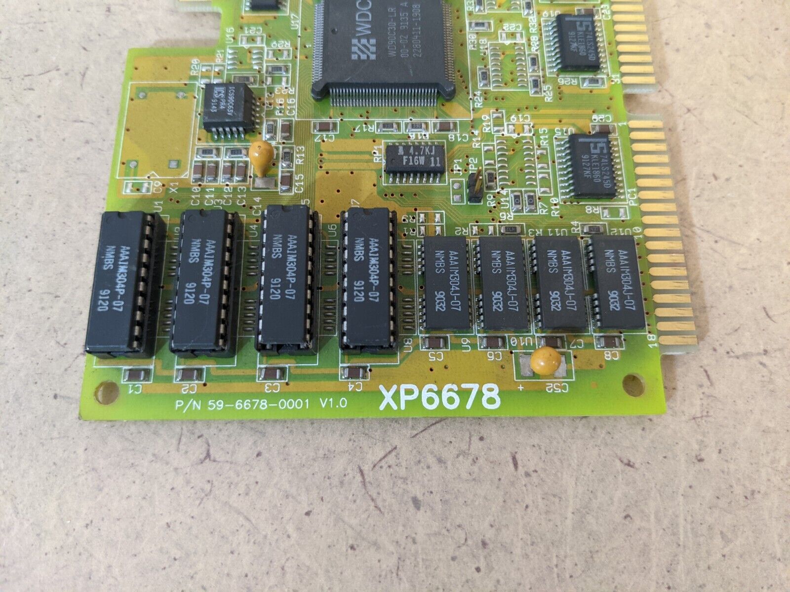 The memory is held in two banks each comprising of four SOP package EDO SDRAM memory ICs. Bank 0 is the lowest four chips and these are soldered in. Bank 1 is the upper four chips/sockets. Up to 4 MB of video memory is supported by the WD9710, though most graphics cards based around this chip came in 1 MB and 2 MB versions only.