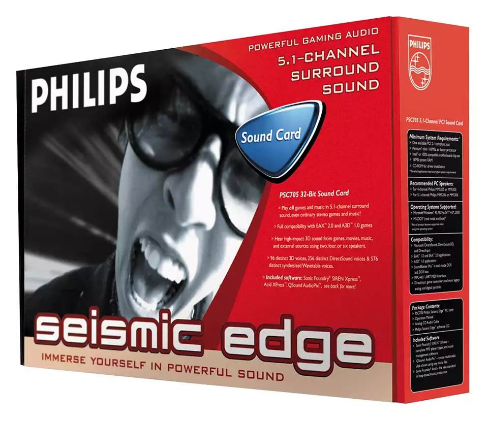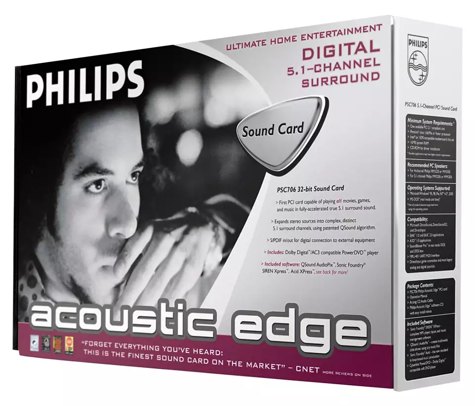The premium choice of the three PCI sound cards Philips launched in 2002, alongside the Rhythmic Edge (cheapest) and Seismic Edge (middling). It is unclear from my findings whether Acoustic Edge was the amalgam of Dynamic Edge 4.1 (with quad surround), and Sonic Edge 5.1 (with 5.1 surround), from this white paper from 2002. The only thing I can tell is that Acoustic Edge had active audio enhancements called QSizzle and QRumble. |
