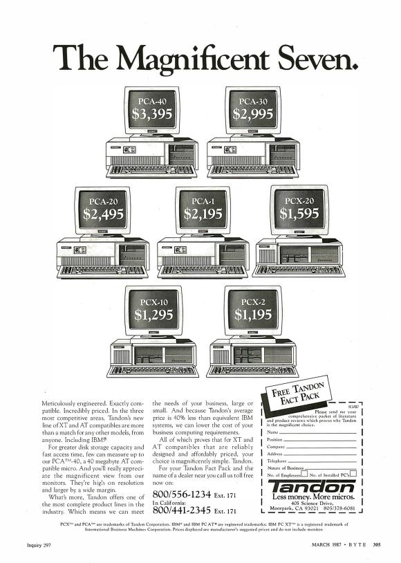 Tandon was a prestigious manufacturer of disk drives and also of personal computers. The company was founded in 1975, initially creating heads for magnetic discs. It obtained a major contract with IBM; up until 1985 they were the only manufacturer of floppy drives for the IBM PC. In the mid-80s they began to create hard drives as well as removable hard drives. It also entered the personal computer market, but strong competition caused it to end up having losses, to sell the hard drive division in 1988 to Western Digital and to disappear from the North American market to the point that by 1989 90% of its computer sales were in Europe.