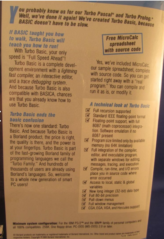 In 1987 Borland released a series of complementary "Turbo Toolboxes" that would work with Turbo BASIC: