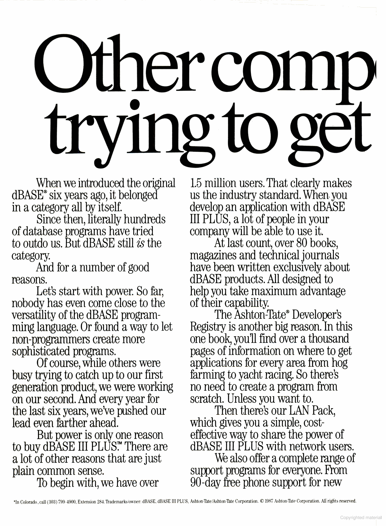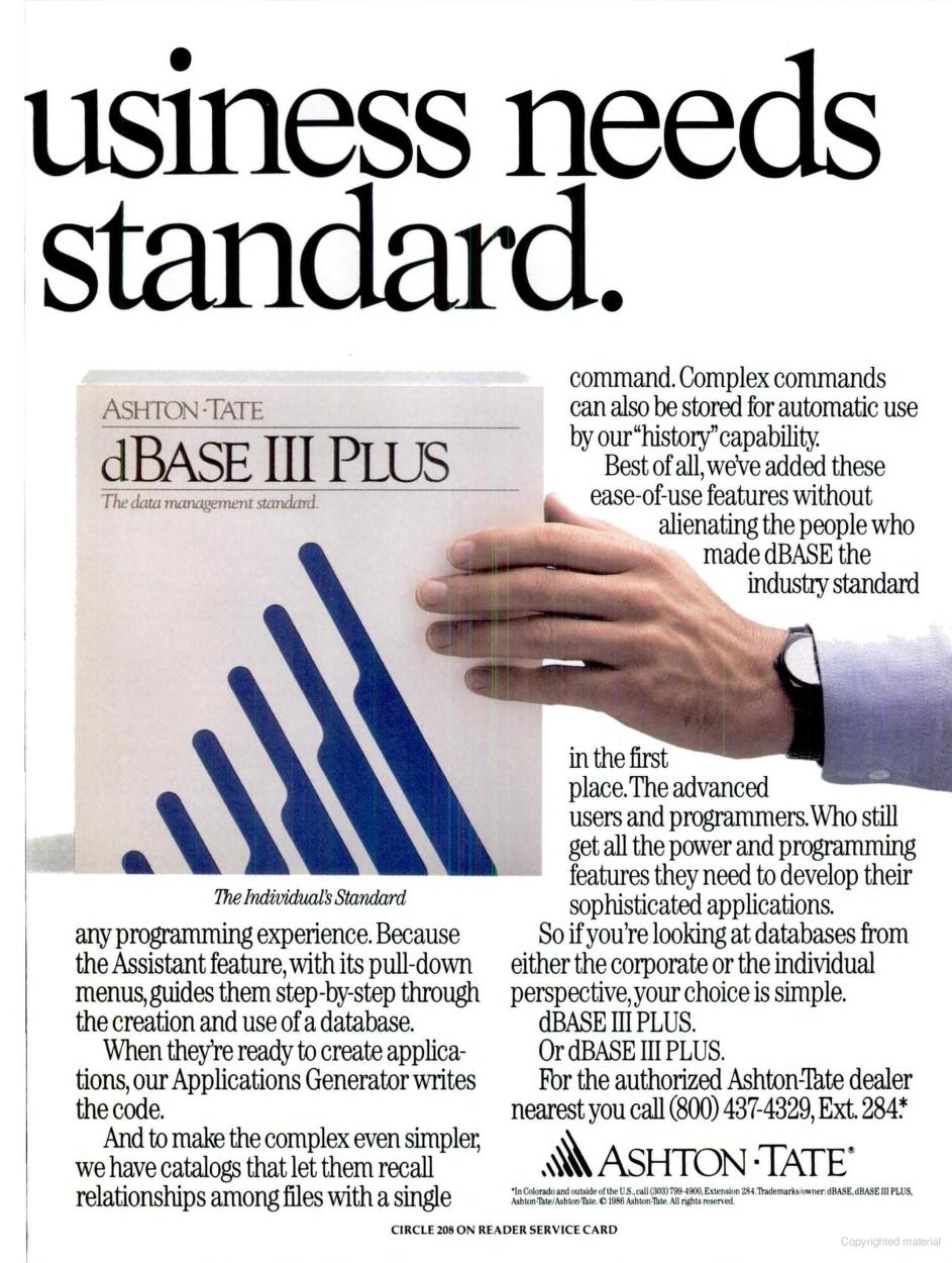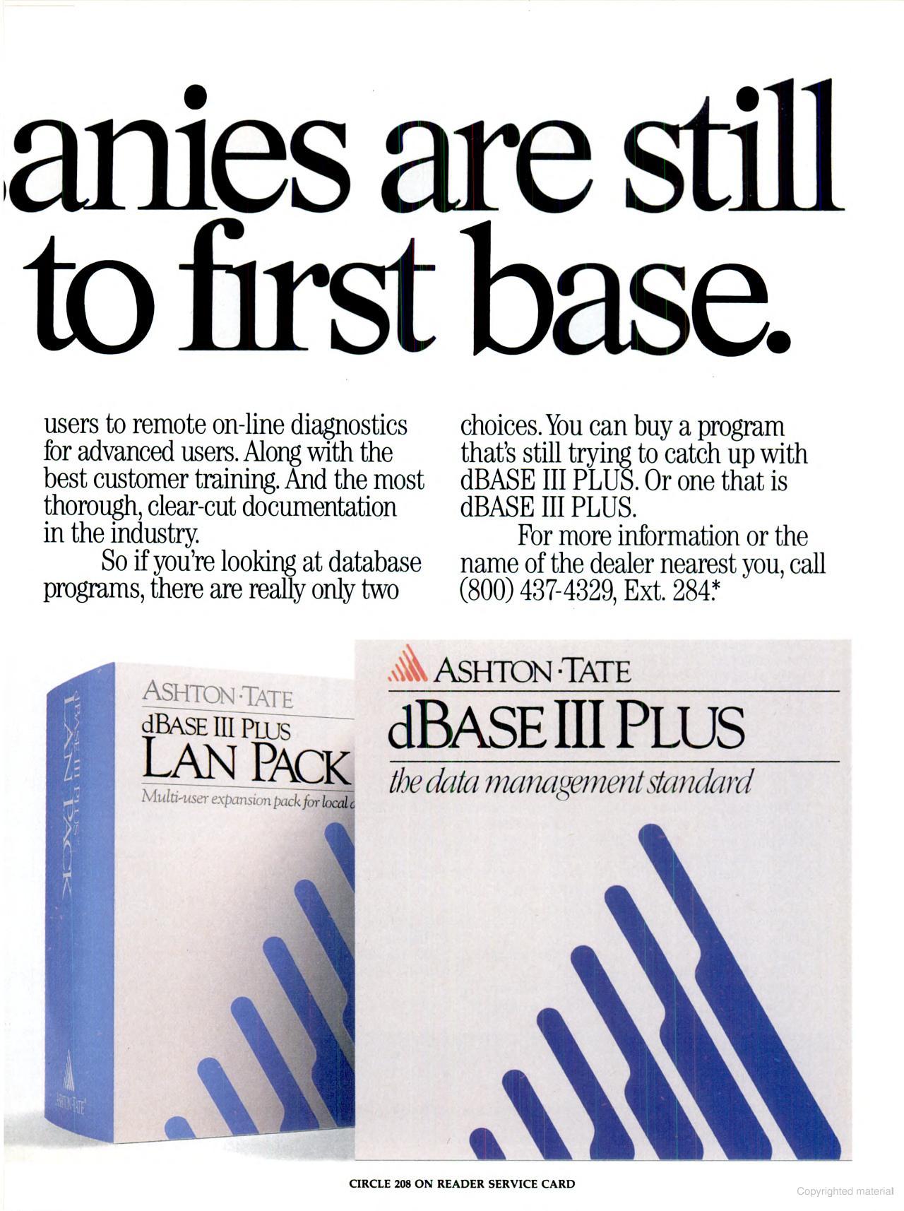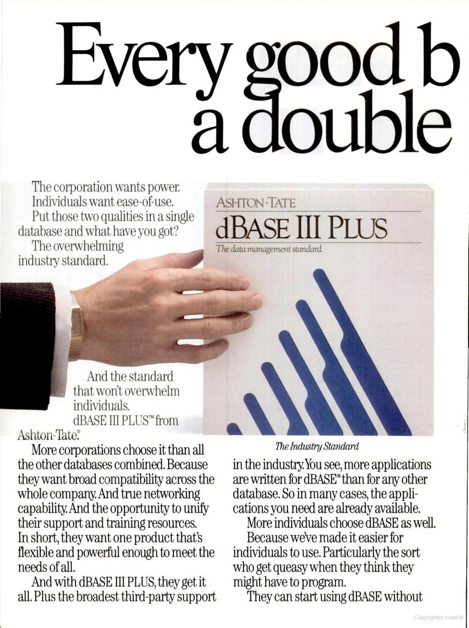 Two advertisements of dBASE III Plus, April 1987 (left) and November 1987 (right)