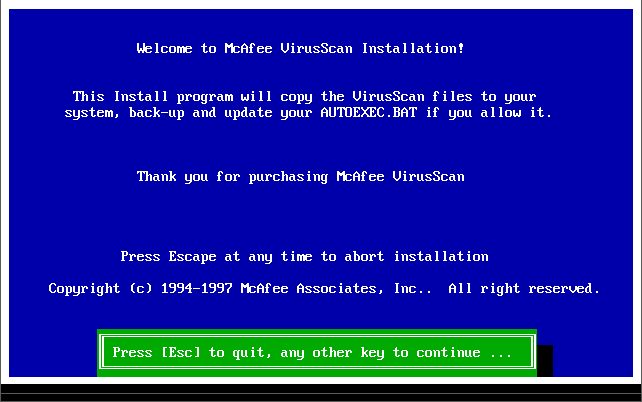 Network Associates continued to release VirusScan after they acquired McAfee Associates, though it was called VirusScan Command Line as their primary products were now all running in Windows. Once installed it had these files in the install directory: