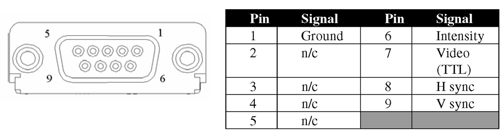 An MDA card's female 9-pin DSUB output connector and its pinouts