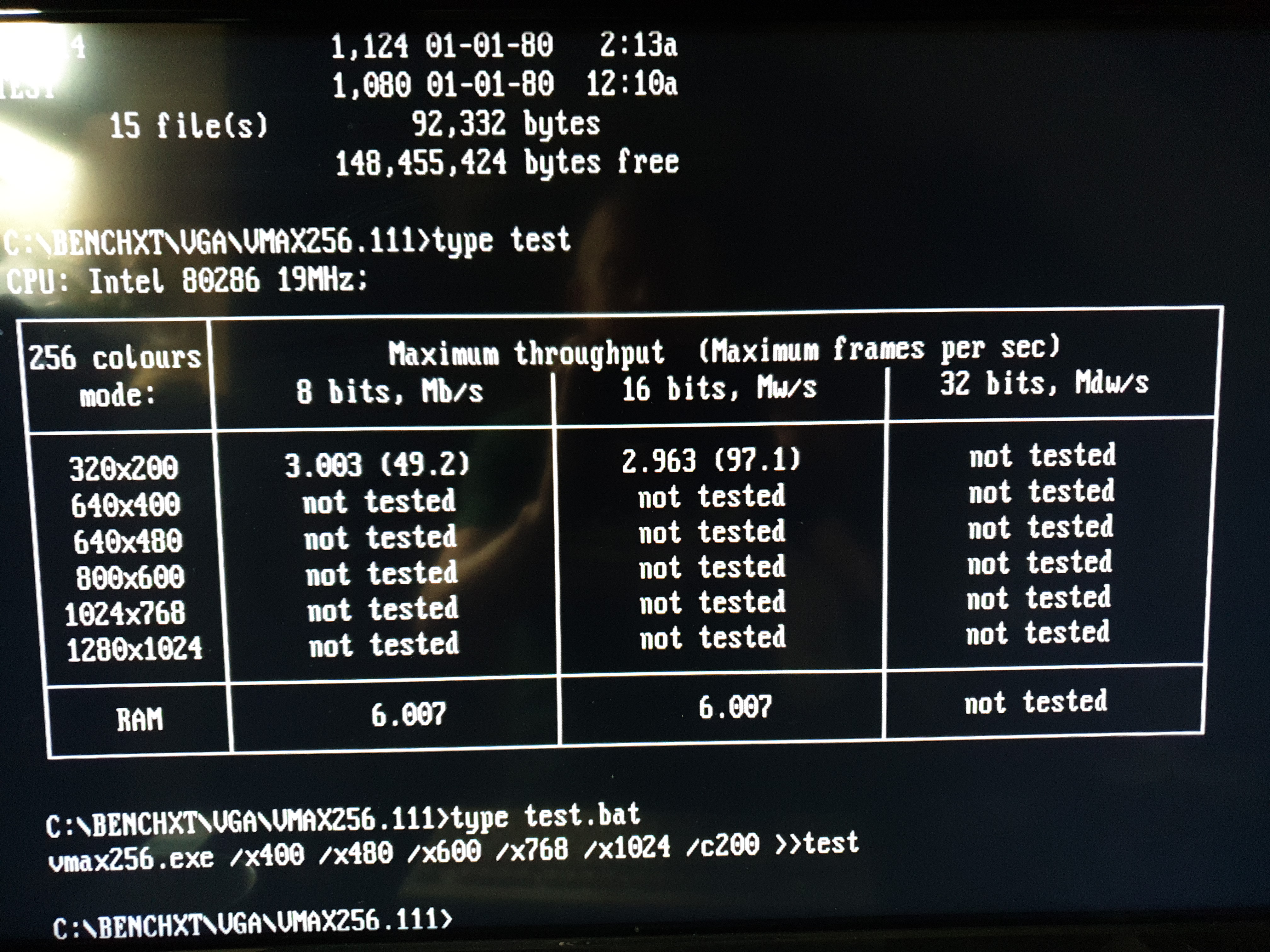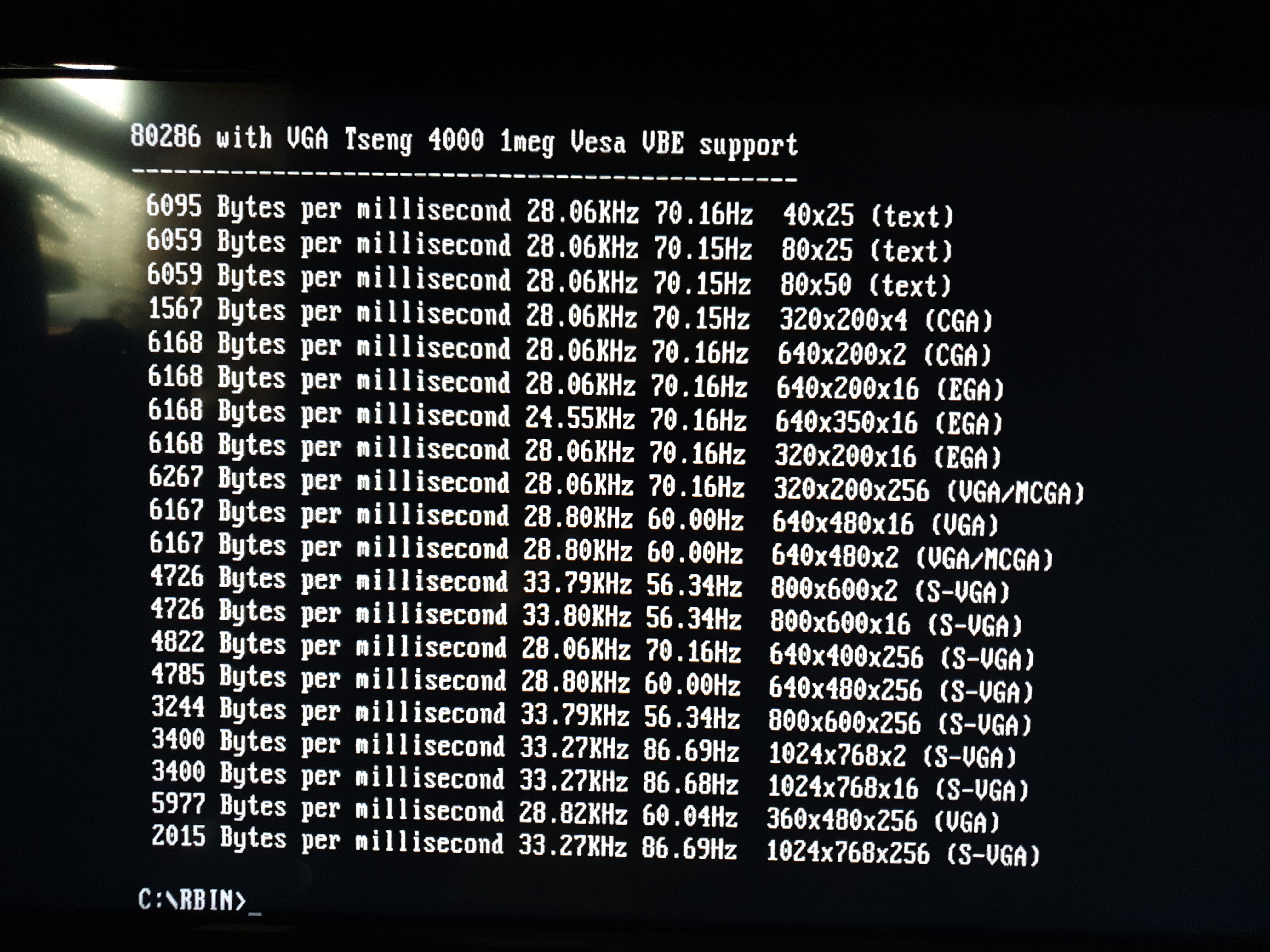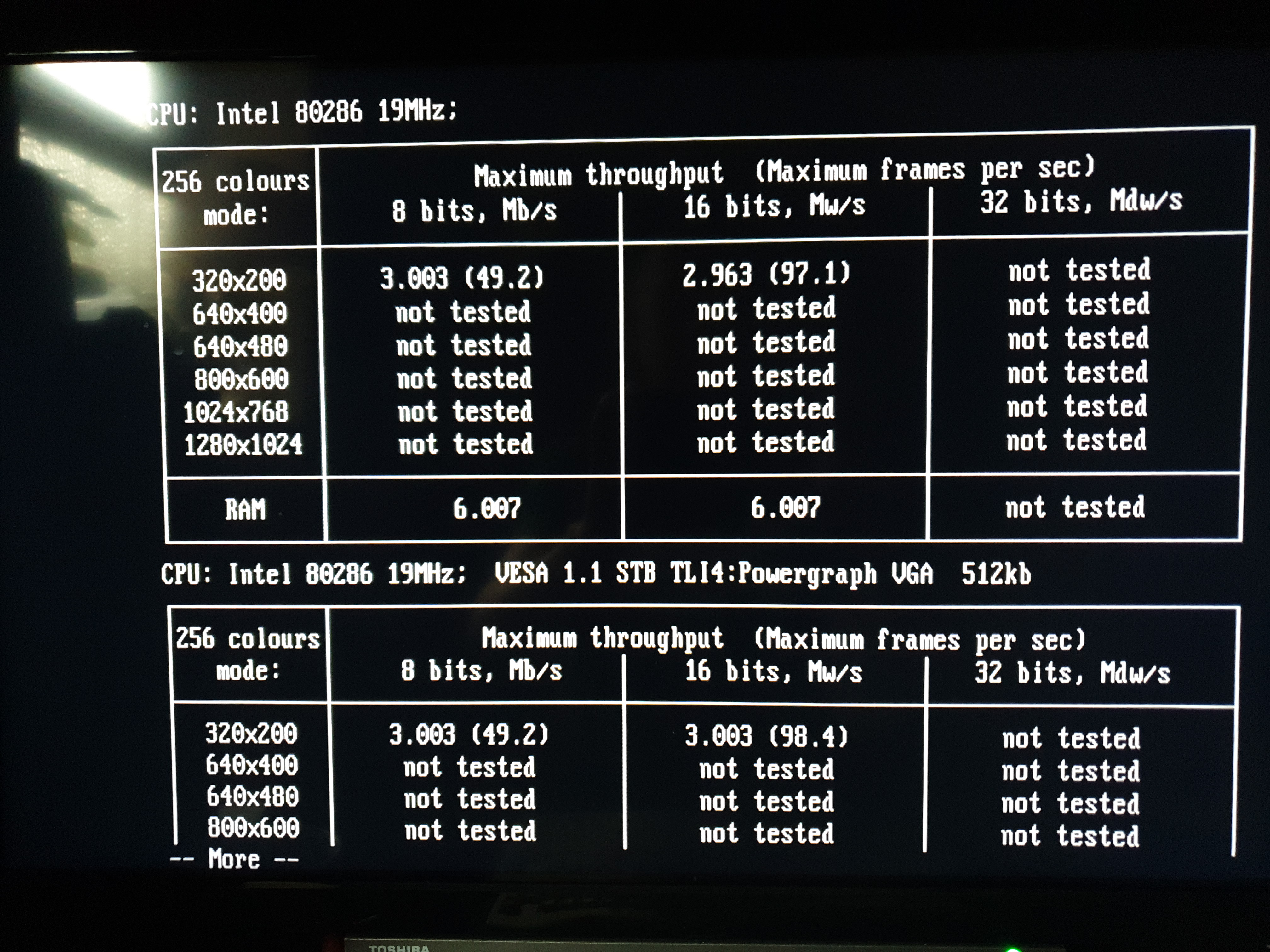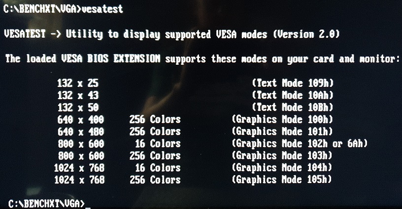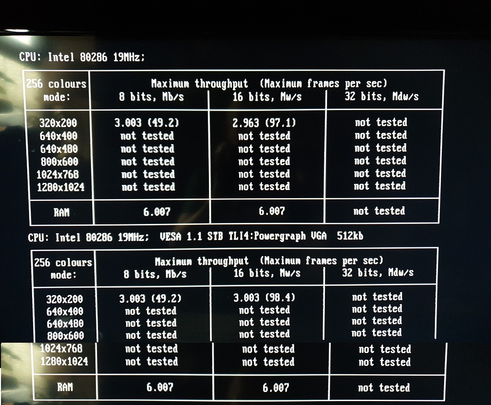 The STB Powergraph 2.0 card above (OEM ID: STB TLI4:Powergraph VGA) features the same Tseng Labs ET4000AX SVGA chipset and the BIOS supports VESA version 1.1 extensions. It has 512 KB of installed video RAM which curiously is a mix of 80ns and 100ns chips made by Micron Technology (MT4C256-8 and MT4C256-10). It seems to function well enough with this mix. I ran VidSpeed on it on my 80286-20 (0WS), and it averaged 6100 bytes/ms at 320 x 200, but at higher resolutions this dipped to 3400 and lower (most likely due to the 512 KB RAM imposing a limit on the video buffer). I also ran Check-It v3.0 and VMax256. I ran VESATest which lists all the video modes supported by the card. This card tops out at a resolution of 1024 x 768 in 256 colours. By filling in the extra DRAM sockets to give this card the full complement of 1 MB, it should be able to get up to 1280 x 1024.