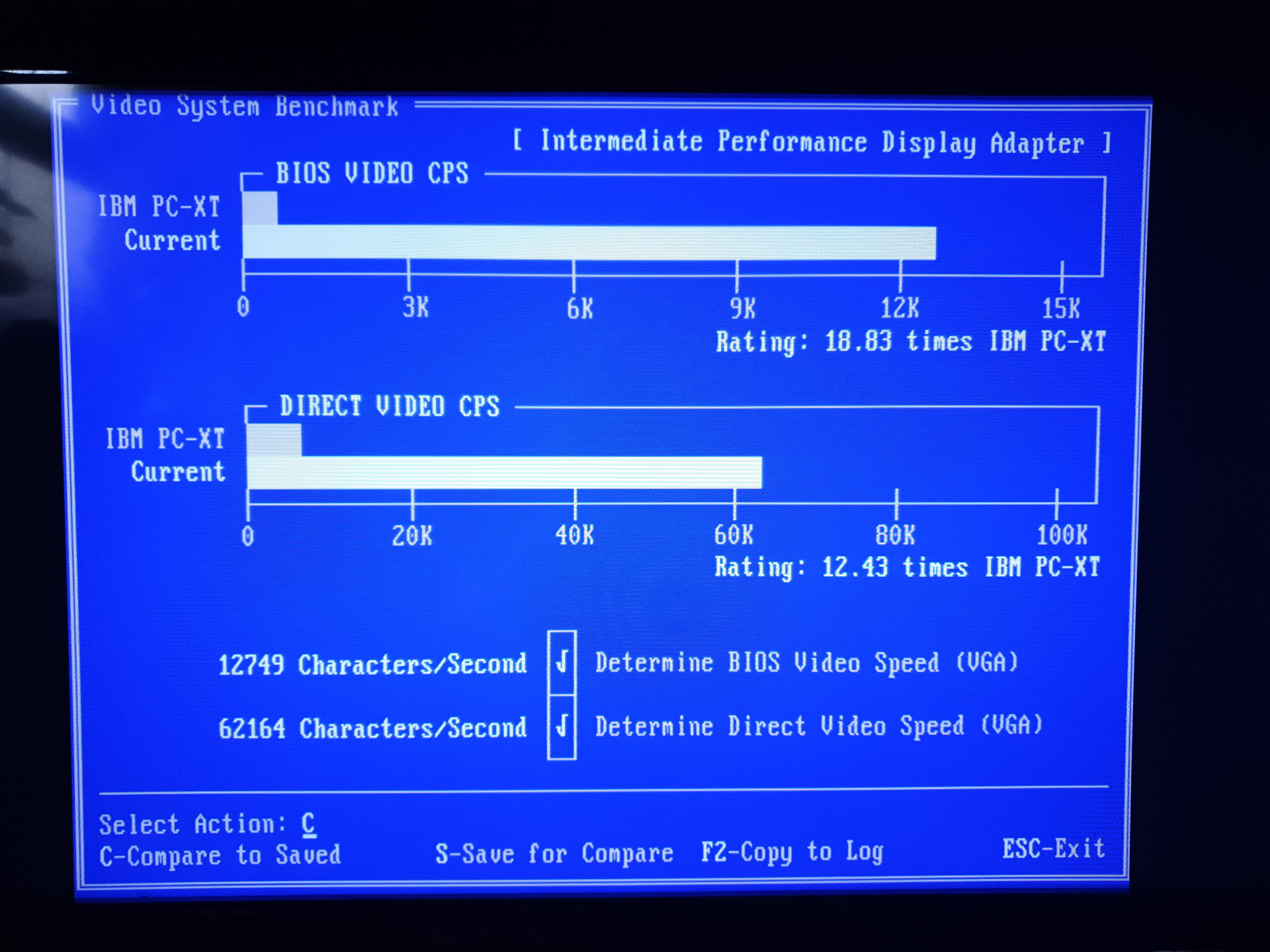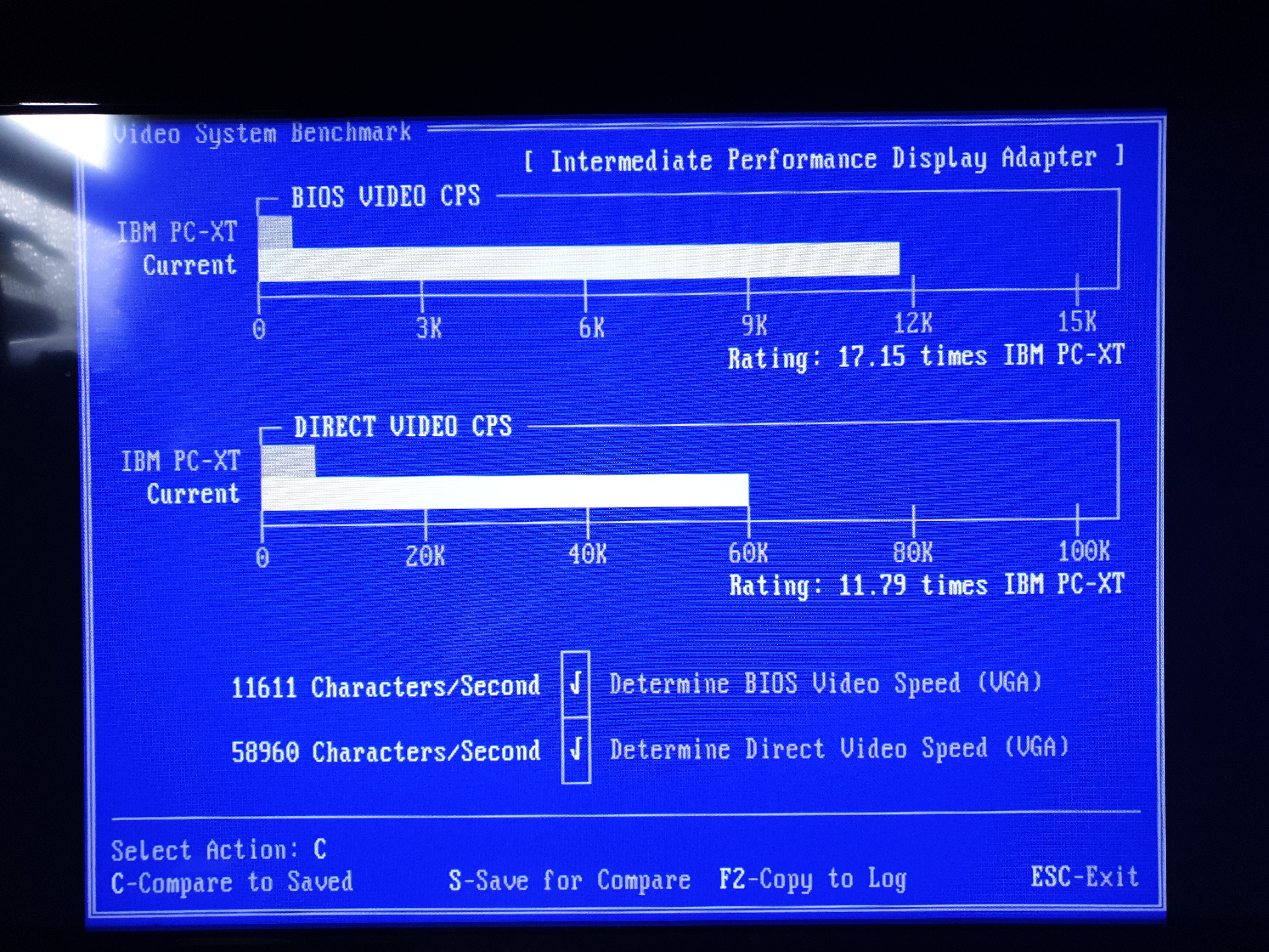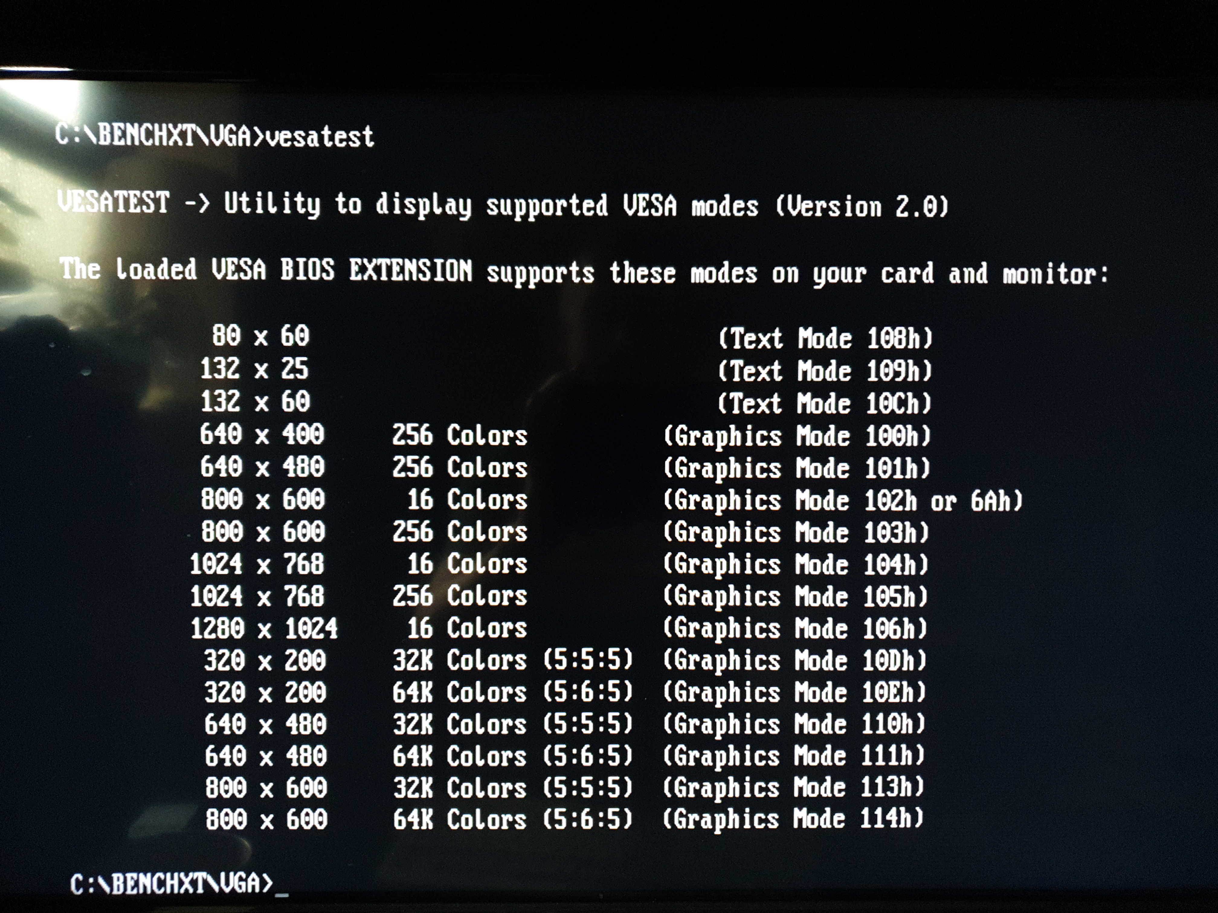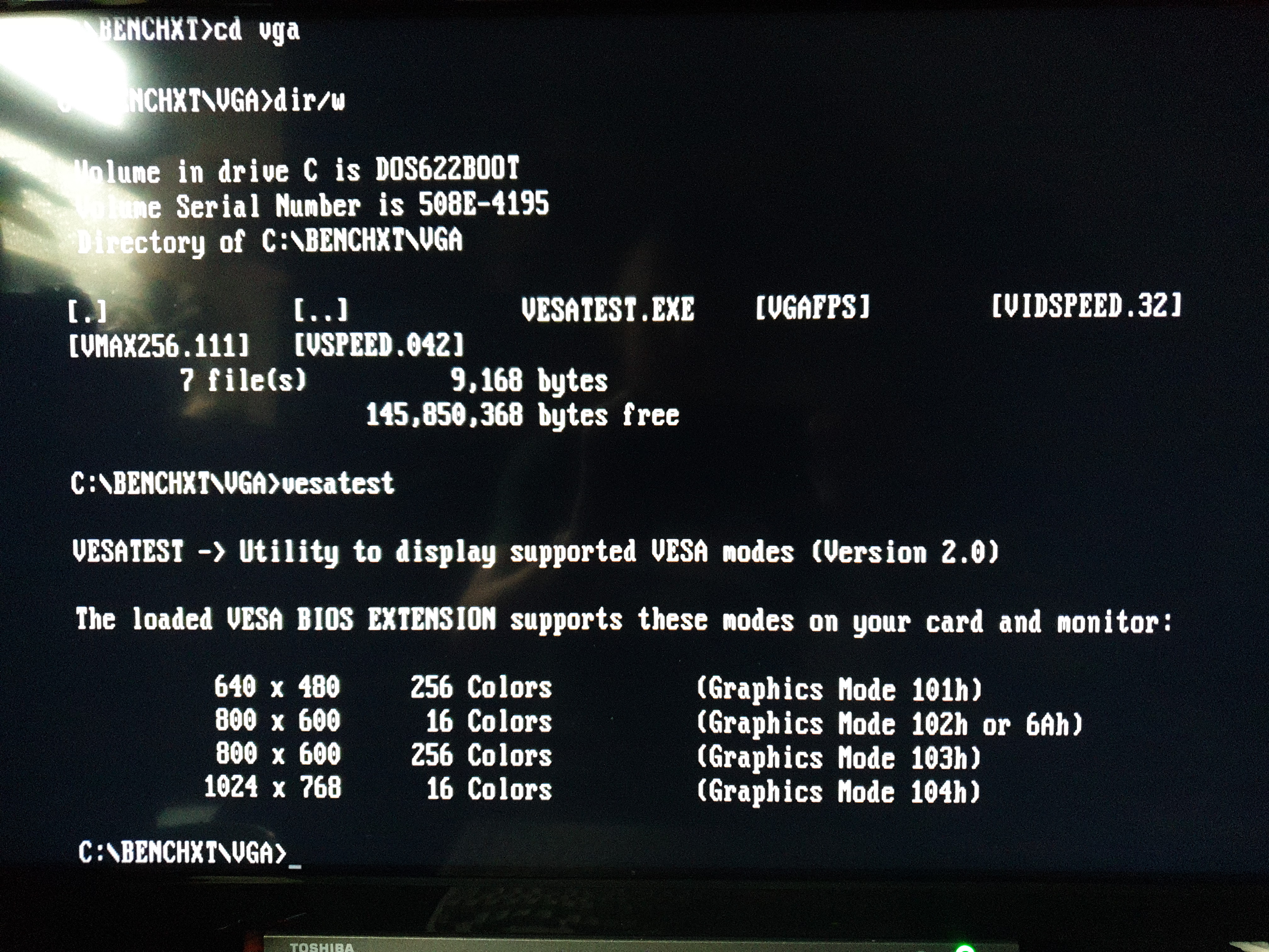The STB Powergraph 2.0 card above (OEM ID: STB TLI4:Powergraph VGA) features the same Tseng Labs ET4000AX SVGA chipset and the BIOS supports VESA version 1.1 extensions. It has 512 KB of installed video RAM which curiously is a mix of 80ns and 100ns chips made by Micron Technology (MT4C256-8 and MT4C256-10). It seems to function well enough with this mix. I ran VidSpeed on it on my 80286-20 (0WS), and it averaged 6100 bytes/ms at 320 x 200, but at higher resolutions this dipped to 3400 and lower (most likely due to the 512 KB RAM imposing a limit on the video buffer). I also ran Check-It v3.0 and VMax256. I ran VESATest which lists all the video modes supported by the card. This card tops out at a resolution of 1024 x 768 in 256 colours. By filling in the extra DRAM sockets to give this card the full complement of 1 MB, it should be able to get up to 1280 x 1024.