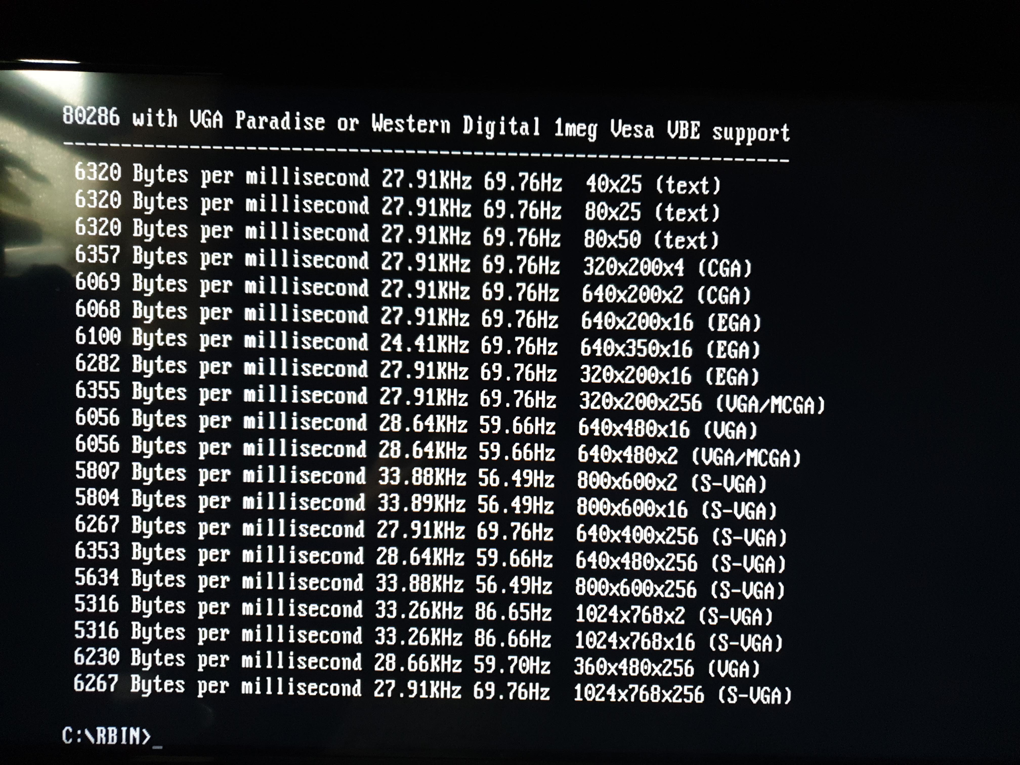 I ran VidSpeed on it on my 80286-20 (0WS), and it averaged 6300 bytes/ms. I also ran Check-It v3.0 and VMax256. I ran VESATest which lists all the video modes supported by the card. This card tops out at a resolution of 1024 x 768 in 16 colours and 800 x 600 in 256 colours. It's the fastest 16-bit ISA card I have, just beating the two Tseng Labs ET4000AX cards in all performance benchmarks I've run. Having said that, it's likely only faster because of its 70ns DRAMs, and if I upgraded my ET4000 with 70ns [or even 60ns] chips it would outperform this WD90C30.