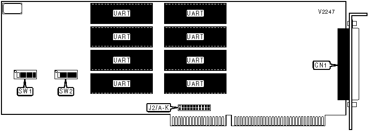 Note: A total of 1024 base address settings are available. The switches are a binary representation of the decimal memory addresses. SW1/1 is the Most Significant Bit and switch SW2/4 is the Least Significant Bit. The switches have the following decimal values: SW1/1=32768, SW1/2=16384, SW1/3=8192, SW1/4=4096, SW1/5=2048, SW1/6=1024, SW2/1=512, SW2/2=256, SW2/3=128, SW2/4=64. Turn off the switches and add the values of the switches that are off to obtain the correct memory address. (Off=1, On=0) Each port takes an additional 8 bytes after this address, for a total of 64 bytes. |