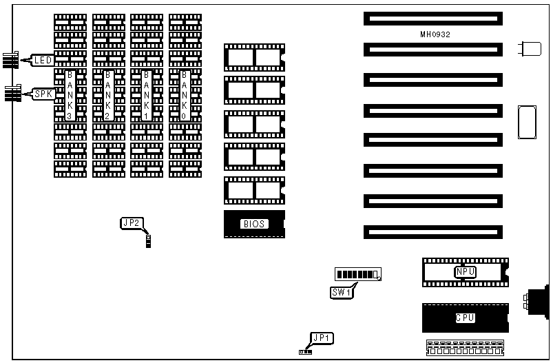 Note: System memory is factory configured at 640KB and should not be removed. Setting JP2 pins 2 & 3 closed forces the system to only recognize 256KB. |