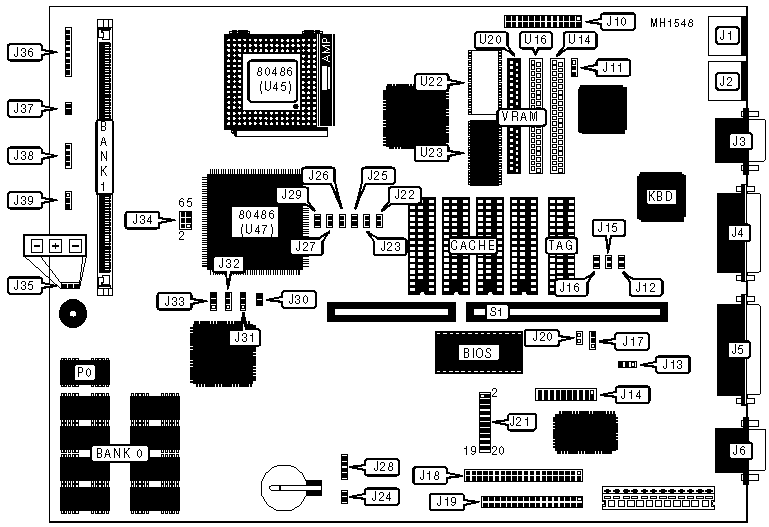 Note:If board is factory installed with 1MB of VRAM, a second 256K x 16 DIP will soldered on the board at U22. If board is factory configured with 512KB of VRAM, U22 will only be a trace, and a 40-pin ZIP socket will be installed at location U20. If the ZIP socket is present, there will also be traces for 2 additional zip sockets at U14 and U16. Sockets installed on ZIP socket traces will not function. |