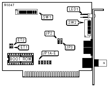 Note:If the card is the last in the line of network cards, the onboard terminator may be enabled instead of using a T-connector and an external terminator. This setting is valid only with the AN-220. If using an AN-120, SW1/10 must be off. (Star topologies do not require the use of terminators) |