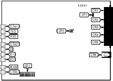 Note:Jumper block JB1 is a one-piece shunt. All pins 1 & 2 or all pins 2 & 3 are closed. CN1 can be either an X.21 or an RS-232 interface on Model 76923. On all other models it is either a V.35 interface or an RS-232 interface. |