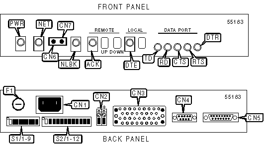 AC power connector, DC power connector, serial port, data port via V.35 connector, network interface via 15-pin connector, injection jack, monitor jack |