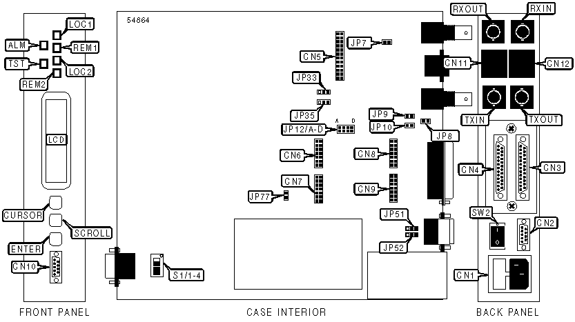 AC power connector, 25-pin connectors (2 RS-530), BNC connectors (4) 9-pin serial ports (2 RS-232), E1 network interface via RJ-48 connectors (4) |