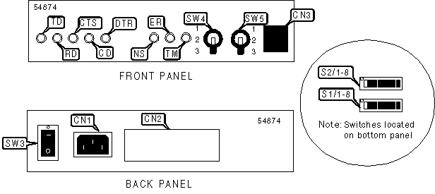 AC power connector, DTE/DCE serial port, network interface via RJ-45 connector |