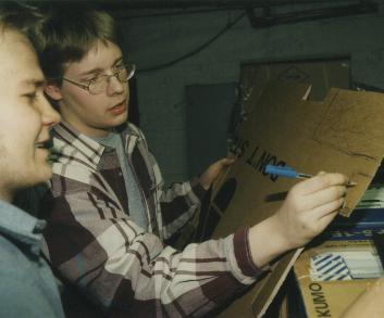 bbs-4.jpg | 2013-02-24 09:29 | 16K | Konehuone, Kalevankatu 1997 - Teimme huolellisesti suunnitelmat ja työpiirustukset. Babar kuuntelee. |