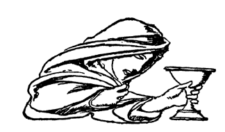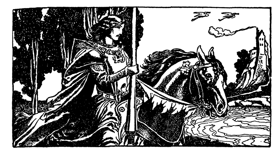 Meanwhile, Queen Helen and Foliot sat together waiting for him to return and presently they heard the sound of his horse's hoofs coming down that rocky path. Then Queen Helen said: "Foliot, methinks my lord cometh." So in a little came the horse with the empty saddle. When Foliot beheld that he said: "Lady, here meseems is great trouble come to us, for methinks something hath befallen my lord, and that he is in sore travail, for here is his horse without him."