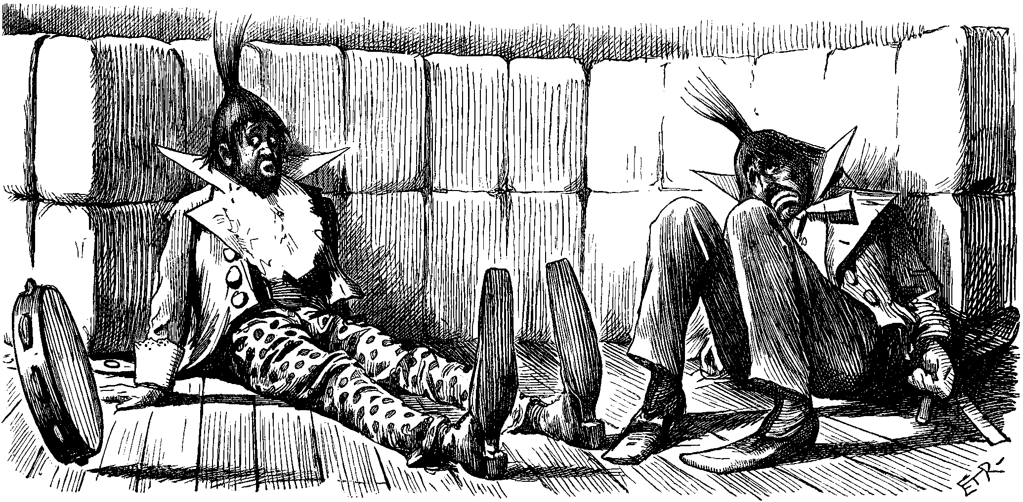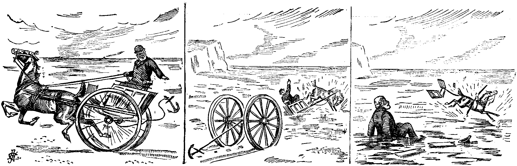 I passed two unhappy-looking stone eagles protecting a boarding-house, and a shed given over to the sale of lollipops and the hiring of a pony-chaise. The cottages seemed to me to be of the boat-turned-bottom-upwards order of architecture, and were adorned with placards, announcing "Apartments to Let." Everything seemed to let, except, perhaps, the church, which, however (on second thoughts), appeared to be let alone. But if the houses were not, in themselves, particularly inviting, their names were pleasing enough, although, truth to tell, a trifle misleading. For instance, there was a "Marine Lodge," which seemed a very considerable distance from the ocean, and a "Swiss chalet," that but faintly suggested the land renowned equally for mountains and merry juveniles. I did not notice any shops, although I fancy, from the appearance of a small barber's pole that I found in front of a cottage, that the hair-dressing interest must have had a local representative. For the rest, an air of hopefulness, if not precisely cheerfulness, was given to the place by the presence of a Convalescent Hospital. Leaving the village behind me, I came, footsore and staggering, at length to the Bay. I was cruelly disappointed. Below me was what appeared to be a small portion of Rosherville, augmented with two bathing-machines, and a residence for the Coast-guard. There was a hotel, (with a lawn-tennis ground), and several placards, telling of land to let. The descent to the sea was very steep, and, on the high road above it, painfully modern villas were putting in a disfiguring appearance. On the beach was a melancholy pic-nic party, engaged in a mild carouse. In the gloaming was a light-ship, marking the end of the Goodwin Sands.