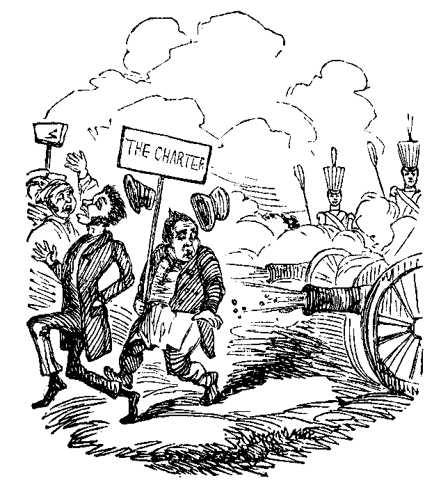 A general chorus of “Pshaw!” greeted this very unsatisfactory rejoinder. Another rush of smoke into the kitchen rendered some more active measures necessary, and, after a short discussion, it was decided that John and Betty should proceed to the roof of the house with two pailsful of water, whilst Agamemnon remained below to watch the effects of the measure. When John and Betty arrived at the chimney-pots, the pother was so confusing, that they were undecided which was the rebellious flue! but, in order to render assurance doubly sure, they each selected the one they conceived to be the delinquent, and discharged the contents of their buckets accordingly, without any apparent diminution of the intestine war which was raging in the chimney. A fresh supply from a cistern on the roof, similarly applied, produced no better effects, and Agamemnon, in an agony of doubt, rushed up-stairs to ascertain the cause of non-abatement. Accidentally popping his head into the drawing-room, what was his horror at beholding the beautiful Brussels carpet, so lately “redolent of brilliant hues,” one sheet of inky liquid, into which Mrs. Waddledot (who had followed him) instantly swooned. Agamemnon, in his alarm, never thought of his wife’s mother, but had rushed half-way up the next flight of stairs, when a violent knocking arrested his ascent, and, with the fear of the whole fire-brigade before his eyes, he re-rushed to open the door, the knocker of which kept up an incessant clamour both in and out of the house. The first person that met his view was a footman, 25, dyed with the same sooty evidence of John and Betty’s exertions, as he had encountered on entering his own drawing-room. The dreadful fact flashed upon Collumpsion’s mind, and long before the winded and saturated servant could detail the horrors he had witnessed in “his missuses best bed-room, in No. 25,” the bewildered proprietor of No. 24 was franticly shaking his innocently offending menials on the leads of his own establishment. Then came a confused noise of little voices in the street, shouting and hurraing in the fulness of that delight which we regret to say is too frequently felt by the world at large at the misfortunes of one in particular. Then came the sullen rumble of the parish engine, followed by violent assaults on the bell and knocker, then another huzza! welcoming the extraction of the fire-plug, and the sparkling fountain of “New River,” which followed as a providential consequence. Collumpsion again descended, as John had at last discovered the right chimney, and having inundated the stewpans and the kitchen, had succeeded in extinguishing the sooty cause of all these disasters. The mob had, by this time, increased to an alarming extent. Policemen were busily employed in making a ring for the exhibition of the water-works—little boys were pushing each other into the flowing gutters—small girls, with astonished infants in their arms, were struggling for front places against the opposite railings; and every window, from the drawing-rooms to the attics, in Pleasant-terrace were studded with heads, in someway resembling the doll heads in a gingerbread lottery, with which a man on a wooden leg was tempting the monied portion of the juvenile alarmists. Agamemnon opened the door, and being flanked by the whole of his household, proceeded to address the populace on the present satisfactory state of his kitchen chimney. The announcement was received by expressions of extreme disgust, as though every auditor considered that a fire ought to have taken place, and that they had been defrauded of their time and excitement, and that the extinguishing of the same by any other means than by legitimate engines was a gross imposition. He was about remonstrating with them on the extreme inconvenience which would have attended a compliance with their reasonable and humane objections, when his eloquence was suddenly cut short by a jet d’eau which a ragged urchin directed over him, by scientifically placing his foot over the spouting plug-hole. This clever manoeuvre in some way pacified the crowd, and after awaiting the re-appearance of the parish engineer, who had insisted on a personal inspection of the premises, they gave another shout of derision and departed.