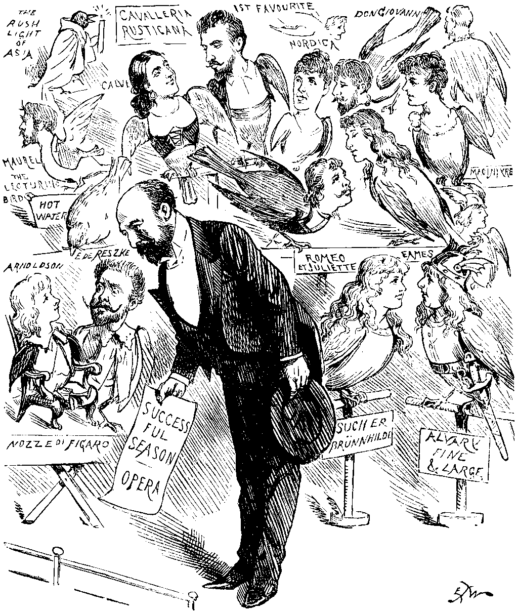 We understand that Sir AUGUSTUS DRURIOLANUS, in addition to his interest in Covent Garden, Drury Lane, the Royal English Opera House, and various enterprises in town, country, and abroad, is about to turn his attention to other matters. On dit that he is in treaty for St. Paul's Cathedral, Westminster Abbey, and the City Temple, for a series of Sunday Oratorios. It is also not improbable that he may become, for a short time, Lessee of Exeter Hall, Buckingham Palace, and the Banqueting-hall of Hampton Court, for a series of Popular Picture-Shows. No doubt he will bring from Russia a new and entire Cosmopolitan Opera Company, to give a performance on the top of the Monument. Should there be an overflow, the audience turned away will be accommodated with seats in the Duke of York's Column. He is said to be in negociation for novelties for next year's London Season in various parts of the globe. It is possible that he may bring over the entire "World's Show" from Chicago, to give a solitary performance on an eligible spot recently acquired for this purpose in the neighbourhood of Primrose Hill. It is not unlikely that he may re-erect the ancient Pyramids at the back of Olympia, if satisfactory arrangements can be made with the Egyptian Government. Looking to the future, it is asserted that he has undertaken to accept the stage-direction of the next European War with those nations bound together in the Treaty of the Triple Alliance. Further—DRURIOLANUS MAXIMUS is considering the transport to London of the North Pole, laying the Zoological Gardens under contribution for a service of bears to climb it. Sir DRURIOLANUS mustn't overdo it. He holds a handful of cards, but he is so good a prestidigitateur that he is pretty sure to transform them into trumps. Likewise Sir DRURIO knows how to perform on the Trump of Fame.