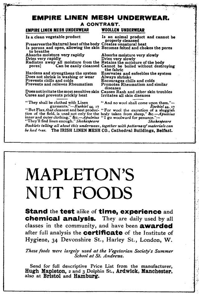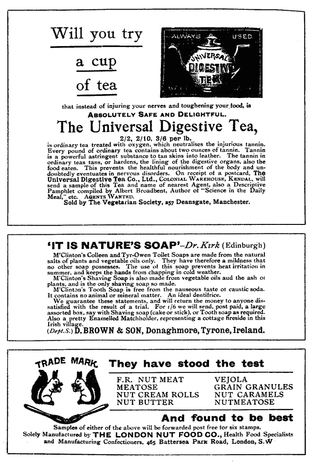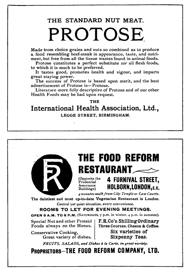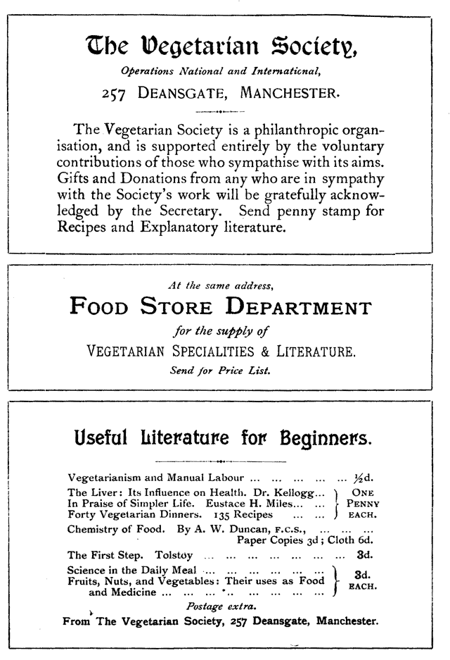 The Vegetarian Society, Food Store Dept and Useful Literature ads