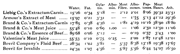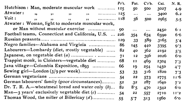 Flesh contains no starch or sugar, but a small quantity of glycogen. The fat in an animal is derived from the carbohydrates, the fats and the proteids of the vegetables consumed. The soil that produced the herbage, grain and roots consumed by cattle, in most cases could have produced food capable of direct utilisation by man. By passing the product of the soil through animals there is an enormous economic loss, as the greater part of that food is dissipated in maintaining the life and growth; little remains as flesh when the animal is delivered into the hands of the butcher. Some imagine that flesh food is more easily converted into flesh and blood in our bodies and is consequently more valuable than similar constituents in vegetables, but such is not the case. Fat, whether from flesh or from vegetables is digested in the same manner. The proteids of flesh, like those of vegetables, are converted into peptone by the digestive juices—taking the form of a perfectly diffusible liquid—otherwise they could not be absorbed and utilised by the body. Thus the products of digestion of both animal and vegetable proteids and fats are the same. Formerly, proteid matter was looked upon as the most valuable part of the food, and a large proportion was thought necessary for hard work. It was thought to be required, not only for the construction of the muscle substance, but to be utilised in proportion to muscular exertion. These views are now known to be wrong. A comparatively small quantity of proteid matter, such as is easily obtained from vegetable food, is ample for the general needs of the body. Increased muscular exertion requires but a slight increase of this food constituent. It is the carbohydrates, or carbohydrates and fats that should be eaten in larger quantity, as these are the main source of muscular energy. The fact that animals, capable of the most prolonged and powerful exertion, thrive on vegetables of comparatively low proteid value, and that millions of the strongest races have subsisted on what most Englishmen would consider a meagre vegetarian diet, should have been sufficient evidence against the earlier view.