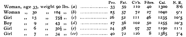 John Goodfellow has shown that of very coarse wholemeal bread quite 14 per cent. was undigested, whilst bread made from ordinary grade wholemeal showed 12.5 per cent. Such a method of analysis was adopted as it was believed would exclude other than the food waste. The experiments were made on a person who was eating nothing but the bread. It seems probable that a smaller proportion would have remained unassimilated had the bread not formed the sole food. It is advisable that wheatmeal he ground as finely as possible, the coarse is not only to a less extent assimilated but apt to irritate the bowels. Notwithstanding that fine white bread gave only 4.2 per cent. and a coarse white bread 4.9 per cent. of waste, a fine wheatmeal bread is more economical as the same quantity of wheat produces a greater weight of flour richer in proteid and mineral matter. From a large number of experiments with man, it has been calculated that of proteids there is digested when animal food is eaten 98 per cent., from cereals and sugars 8 per cent., from vegetables and fruits 80 per cent. The difference between the proportions digested of the other food constituents was much less. Although there is here a theoretical advantage in favour of animal food, there are other considerations of far more importance than a little undigestible waste. The main question is one of health. In some dietary experiments of a girl aged 7, living upon a fruit diet, of whom we have given some particulars elsewhere, Professor Jaffa gives the following particulars. During the ten days trial the percentages absorbed were proteids 82.5, fat 86.9, nitrogen free extract 96, crude fibre 80, ash 5.7, heat of combustion in calories 86.7. He says, "generally speaking, the food was quite thoroughly assimilated, the coefficients of digestibility being about the same as are found in an ordinary mixed diet. It is interesting to note that 80 per cent. of the crude fibre appeared to be digested. The results of a number of foreign experiments on the digestibility of crude fibre by man are from 30 to 91.4 per cent., the former value being from mixed wheat and rye, and the latter in a diet made of rice, vegetables and meat."