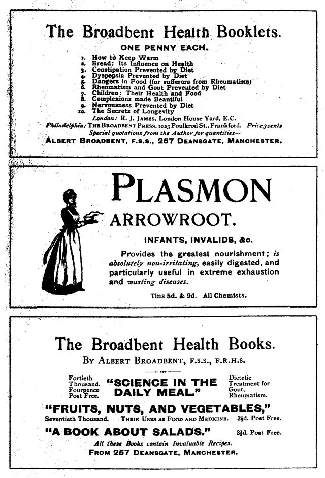 Those who wish to thoroughly study the science of food are referred to the standard work, "Food and Dietetics," by Dr. R. Hutchison (E. Arnold, 16s.). The effects of purin bodies in producing illness has been patiently and thoroughly worked out by Dr. Alexander Haig. Students are referred to his "Uric Acid, an epitome of the subject" (J. & A. Churchhill, 1904, 2s.6d.), or to his larger work on "Uric Acid." An able scientific summary of investigations on purins, their chemical and pathological properties, and the quantities in foods will be found in "The Purin Bodies of Food Stuffs," by Dr. I. Walker Hall (Sherratt & Hughes, Manchester, 1903, 4s.6d.). The U.S. Department of Agriculture has made a large number of elaborate researches on food and nutrition. My thanks are due to Mr. Albert Broadbent, the Secretary of the Vegetarian Society, for placing some of their bulletins in my hands, and for suggestions and help. He has also written several useful popular booklets on food of a very practical character, at from a penny to threepence each.