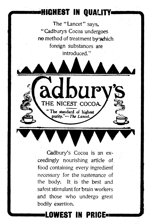 Stimulants.—Tea and coffee contain an alkaloid theine, besides volatile oils, tannin, &c. Cocoa contains the milder alkaloid, theobromine. They stimulate the heart and nervous systems; tea and coffee have also a diuretic effect. Formerly they were erroneously thought to lessen tissue waste. These alkaloids, being purins, are open to the general objections named elsewhere. Stimulants do not impart energy or force of any kind, but only call forth reserve strength by exciting the heart, nervous system, &c., to increased activity. This is followed by a depression which is as great, generally greater, than the previous stimulation. Except, perhaps, as an occasional medicine, stimulants, should be avoided. Analysis of cocoa shows a good proportion of proteids and a very large quantity of fat. The claim that it is a valuable and nutritious food would only be true if it could be eaten in such quantities as are other foods (bread, fruits, &c.). Were this attempted, poisoning would result from the large quantity of alkaloid. The food value of half a spoonful or thereabouts of cocoa is insignificant. Certain much advertised cocoa mixtures are ridiculous in their pretentions, unscientific in preparation, and often injurious.