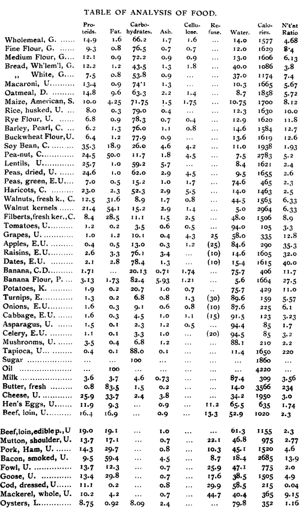 There is considerable variation in the same kind of food, according to the variety of seed and conditions of growth &c., especially is this the case with wheat and flour; whenever it has been possible the average of the analyses of many samples have been given. The method of analysis has not always been uniform, frequently the cellulose is included with the carbo-hydrates, and the proteid sometimes includes a very appreciable quantity of non-proteid nitrogenous matter. This is the case in the analysis of the mushrooms. G.—Analyses are by John Goodfellow; it will be noticed that the wheatmeal bread is not made from the same flour as the whole-meal. D.—B. Dyer, average of 19 fine and coarse oatmeals. S, from U.S. Cons. Reports, 1899. C.—A.H. Church. The walnut kernels are in the dried condition as purchased; originally of the same composition as shewn in the fresh kernels. C.D.—Cavendish or Figi variety of banana, analysis by D.W.M. Doherty, N.S. Wales. P.—A. Petermann, U.S. Cons. Banana flour, musca paradisiaca variety. This is widely used in Central America. The flour is from the unripe fruit, and contains starch 45.7 per cent.; on ripening the starch is converted into sugar. K.—Konig, mean of 90 analysis. Milk:—Average of many thousand analyses of the pure. Butter.—Made without salt. L, from the "Lancet," 1903, I, p. 72. Oysters at 2/6 per dozen. The 8.09 per cent. includes 0.91 glycogen (animal starch). The shell was of course excluded, also the liquid in the shell. Apples.—The refuse includes seeds, skin, &c., and such edible portion as is wasted in cutting them away; the analysis was made on the rest.