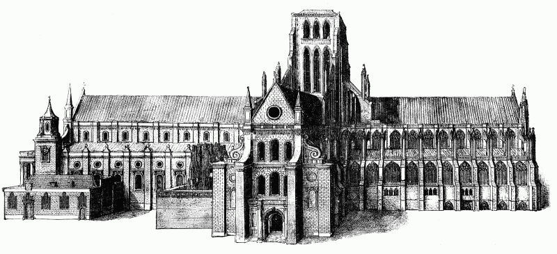 Wenceslaus Hollar—to whose engravings of Old St. Paul's we are indebted for our exceptional knowledge of the aspect of a building that has perished—was born in Prague in 1607, and was brought to England by the Earl of Arundel, who had seen some of his work at Cologne. He soon obtained profitable employment, producing engravings both of figures and views in rapid succession, and about 1639 he was appointed drawing-master to the Prince of Wales, afterwards Charles II. On the outbreak of the Civil War he served as a soldier in the Royalist ranks, and was taken prisoner at Basing House, but escaped to Antwerp. Obtaining very poor employment there, he returned to England in 1652, and was engaged upon the plates for Dugdale's History of St. Paul's and other works, for which, however, he is said by Vertue to have received very small pay, about fourpence an hour, "at his usual method by the hour-glass."