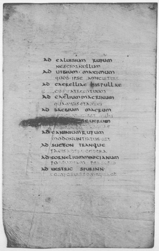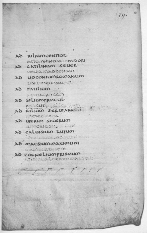 A glance at the abbreviations used in the index of addresses on foll. 48v-49r teaches that the original from which our manuscript was copied must have had its names abbreviated in exactly the same form. There is no other way of explaining why the scribe first wrote ad iulium seruianum (fol. 49, l. 12), and then erased the final um and put a point after seruian.