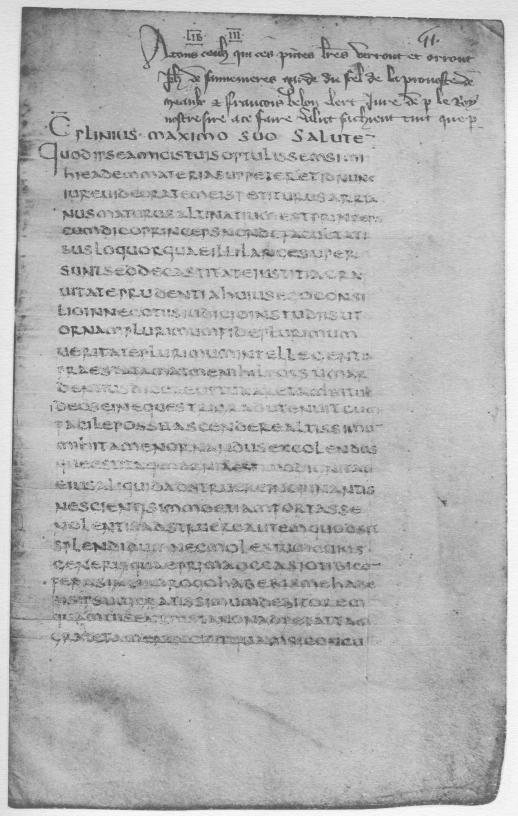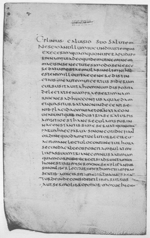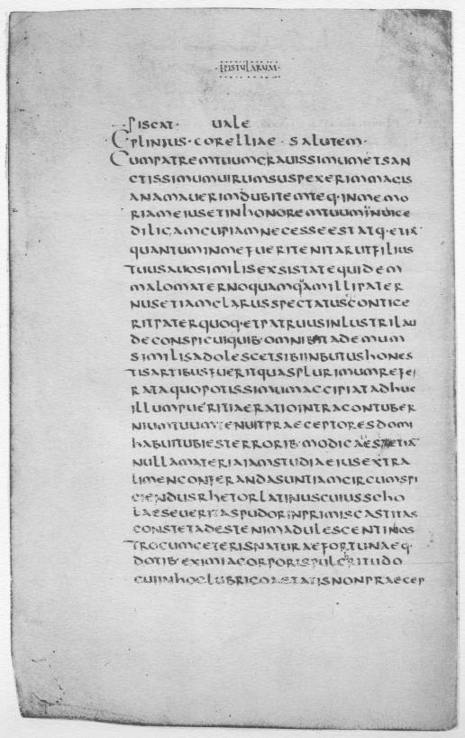 Among the oldest manuscripts of the library, in fact the oldest, is a hitherto unnoticed fragment of great significance not only to palaeographers, but to all students of the classics. It consists of six leaves of an early sixth-century manuscript of the Letters of the younger Pliny. This new witness to the text, older by three centuries than the oldest codex heretofore used by any modern editor, has reappeared in this unexpected quarter, after centuries of wandering and hiding. The fragment was bought by the late J. Pierpont Morgan in Rome, in December 1910, from the art dealer Imbert; he had obtained it from De Marinis, of Florence, who had it from the heirs of the Marquis Taccone, of Naples. Nothing is known of the rest of the manuscript.