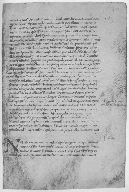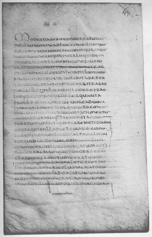 There is a ninth-century addition on fol. 53 and one of the fifteenth century on fol. 51. On fol. 49, in the upper margin, a fifteenth-century hand using a stilus or hard point scribbled a few words, now difficult to decipher.10 Presumably the same hand drew a bearded head with a halo. Another relatively recent hand, using lead, wrote in the left margin of fol. 53v the monogram QR11 and the roman numerals i, ii, iii under one another. These numerals, as Professor 8 Rand correctly saw, refer to the works of Pliny the Elder enumerated in the text. Further activity by this hand, the date of which it is impossible to determine, may be seen, for example, on fol. 49v, ll. 8, 10, 15; fol. 52, ll. 4, 10, 13, 21, 22; fol. 53, ll. 12, 15, 16, 17, 20, 27; fol. 53v, ll. 5, 10, 15.