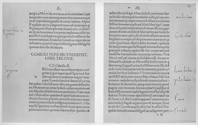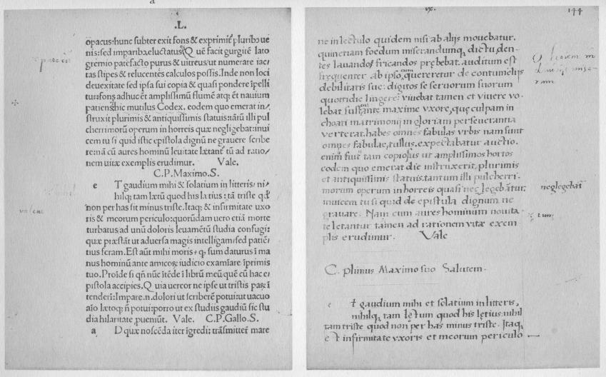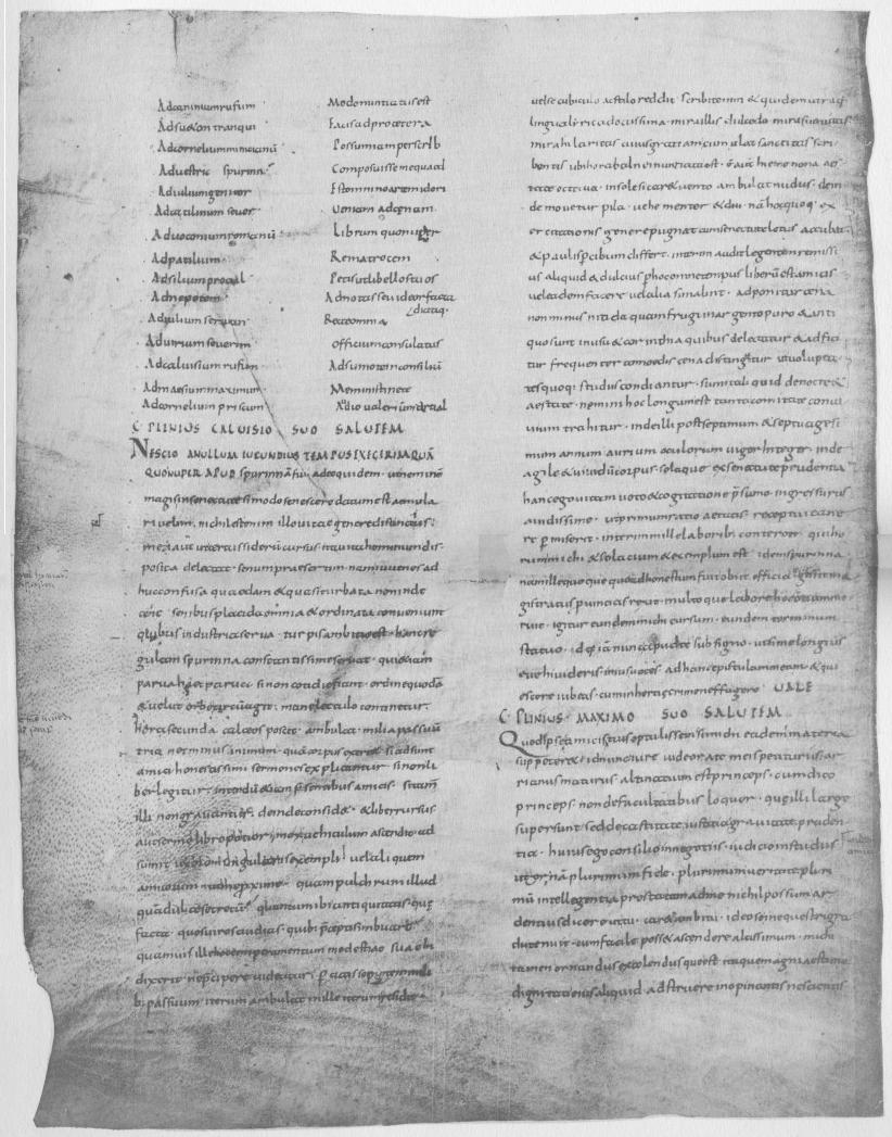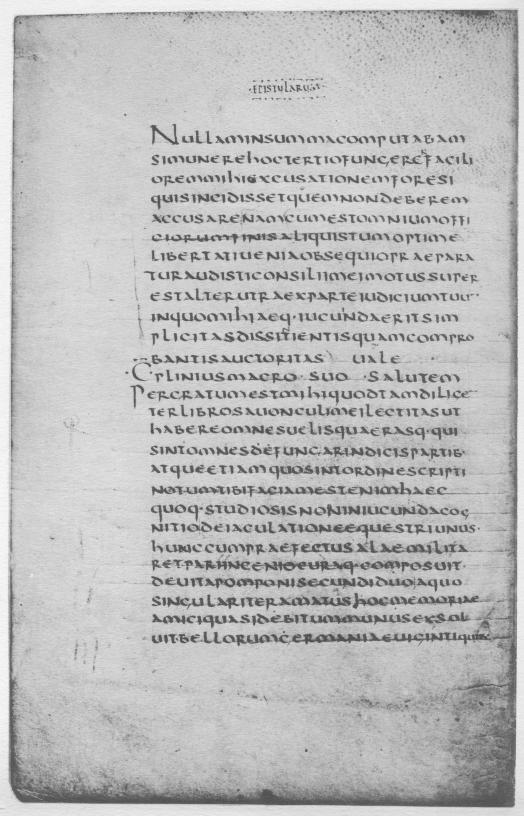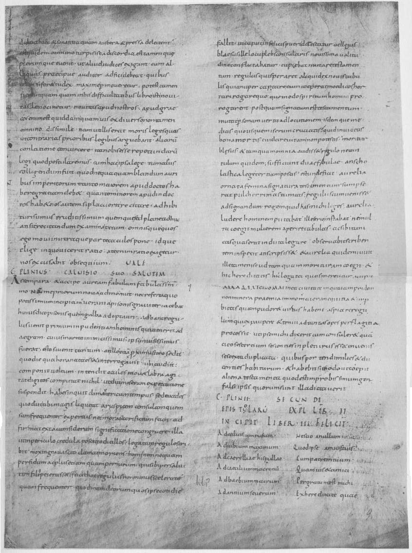 It is not worth while to attempt a more elaborate calculation. With the edges matching so nearly, it is obvious that the original manuscript as known and used in the fifteenth century could not have contained some other work, however brief, before Book I of Pliny’s Letters. If the manuscript contained the entire ten books it consisted of about 260 leaves. This sum is obtained by counting the number of lines in the Teubner edition of 1912, dividing this sum by 19, and adding thereto pages for colophons and indices. It would be too bold to suppose that this calculation necessarily gives us the original size of the manuscript, since the manuscript may have had less than ten books, or it may, on the other hand, have had other works. But if it contained only the ten books of the Letters, then 260 folios is an approximately correct estimate of its size.