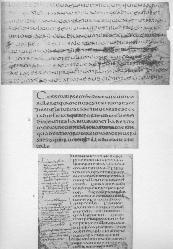 A scientific classification, however, can rest only on objective criteria—criteria which, once recognized, are acceptable to all. Such criteria are made possible by the presence of dated manuscripts. Now, if by a dated manuscript we mean a manuscript of which we know, through a subscription or some other entry, that it was written in a certain year, there is not a single dated manuscript in uncial writing which is older than the seventh century—the oldest manuscript with a precise date known to me being the manuscript of St. Augustine written in the Abbey of Luxeuil in A.D. 669.26 But there are a few manuscripts of which we can say with certainty that they were written either before or after some given date. And these manuscripts which furnish us with a terminus ante quem or post quem, as the case may be, are extremely important to us as being the only relatively safe landmarks for following development in a field that is both remote and shadowy.