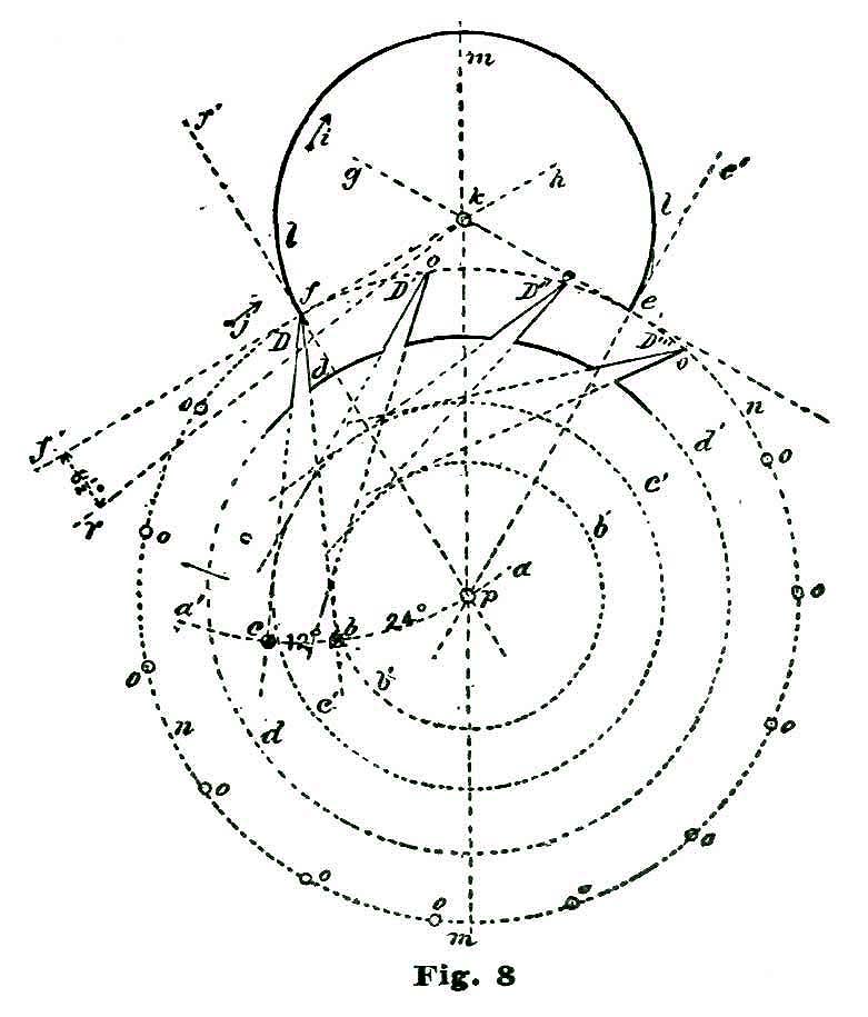 In clocks, the back-and-forth movement, or oscillating motion, is obtained by employing a pendulum; in a movable timepiece we make use of an equally-poised wheel of some weight on a pivoted axle, which device we term a balance; the vibrations or oscillations being obtained by applying a coiled spring, which was first called a "pendulum spring," then a "balance spring," and finally, from its diminutive size and coil form, a "hairspring." We are all aware that for the motive power for keeping up the oscillations of the escaping circle l we must contrive to employ power derived from the teeth D of the escape wheel. About the most available means of conveying power from the escape wheel to the oscillating arc l is to provide the lip of said arc with an inclined plane, along which the tooth which is disengaged from l at f to slide and move said arc l through—in the present instance an arc of eight and one-half degrees, during the time the tooth D is passing through ten and one-half degrees. This angular motion of the arc l is represented by the radial lines k f' and k r, Fig. 8. We desire to impress on the reader's mind the idea that each of these angular motions is not only required to be made, but the motion of one mobile must convey power to another mobile.