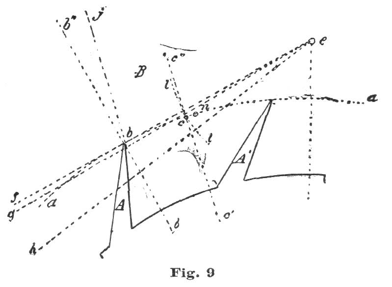 From the intersection of the line f e with the arc i we lay off eight and one-half degrees, and through this point draw the line e h. Bear in mind that we are drawing the pallet at B to represent one with eight and one-half degrees fork-and-pallet action, and with equidistant lockings. If we reason on the matter under consideration, we will see the tooth A and the pallet B, against which it acts, part or separate when the tooth arrives at the point c; that is, after the escape wheel has moved through ten and one-half degrees of angular motion, the tooth drops from the impulse face of the pallet and falls through one and one-half degrees of arc, when the tooth A'', Fig. 10, is arrested by the exit pallet.