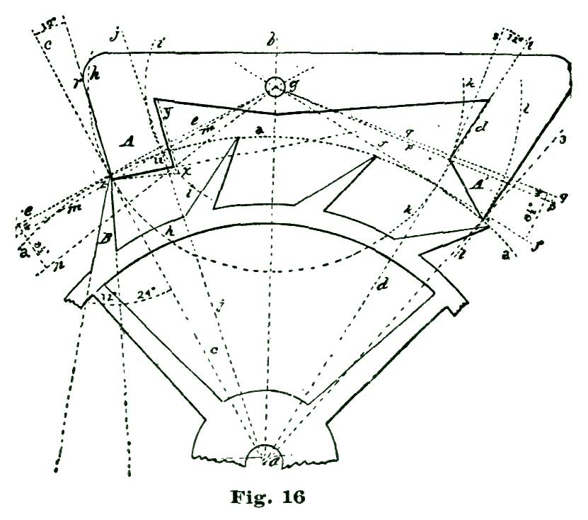 We will now, with our improved drawing instruments, resume the consideration of the ratchet-tooth lever escapement. We reproduce at Fig. 16 a portion of diagram III, from Moritz Grossmann's "Prize Essay on the Detached Lever Escapement," in order to point out the error in delineating the entrance pallet to which we previously called attention. The cut, as we give it, is not quite one-half the size of Mr. Grossmann's original plate.