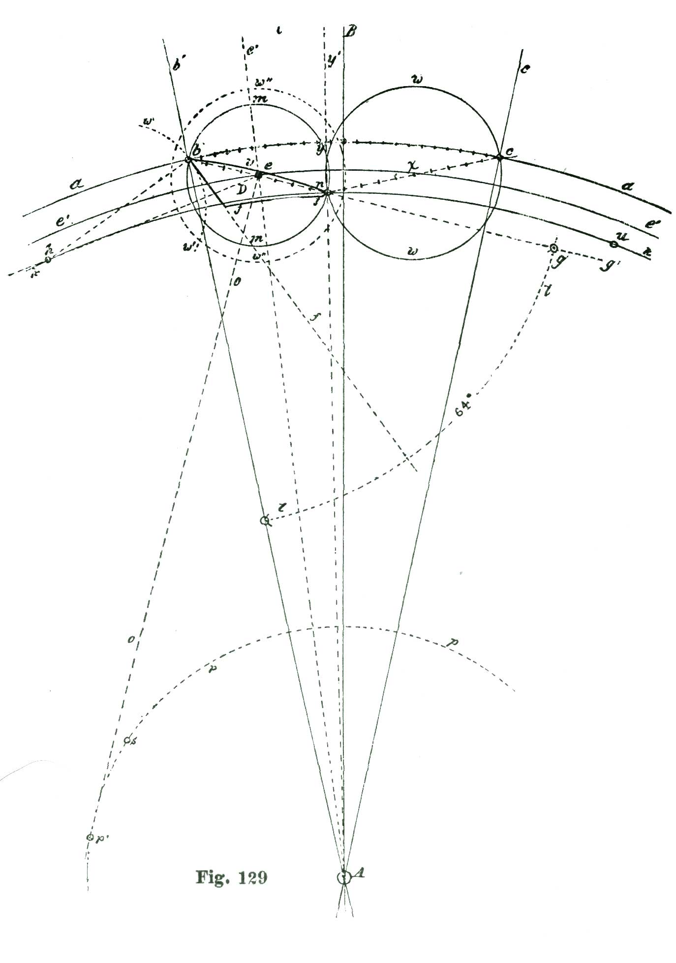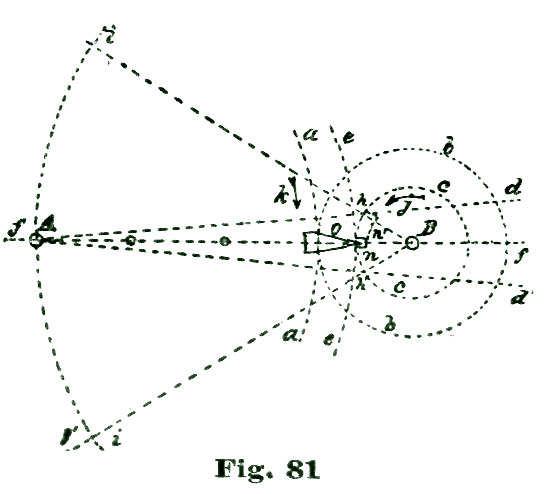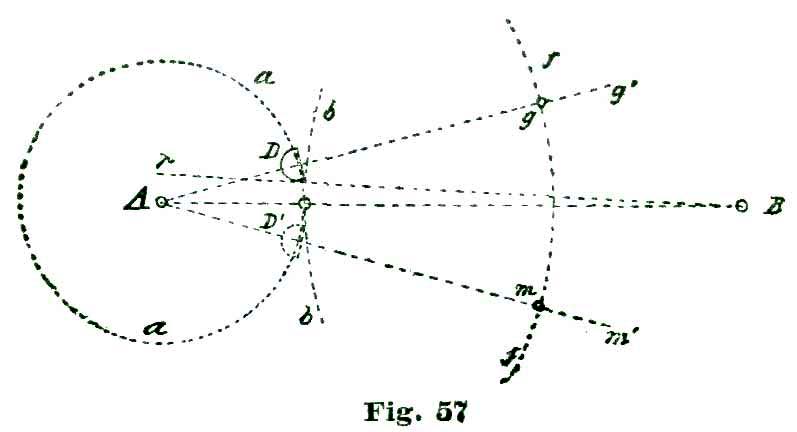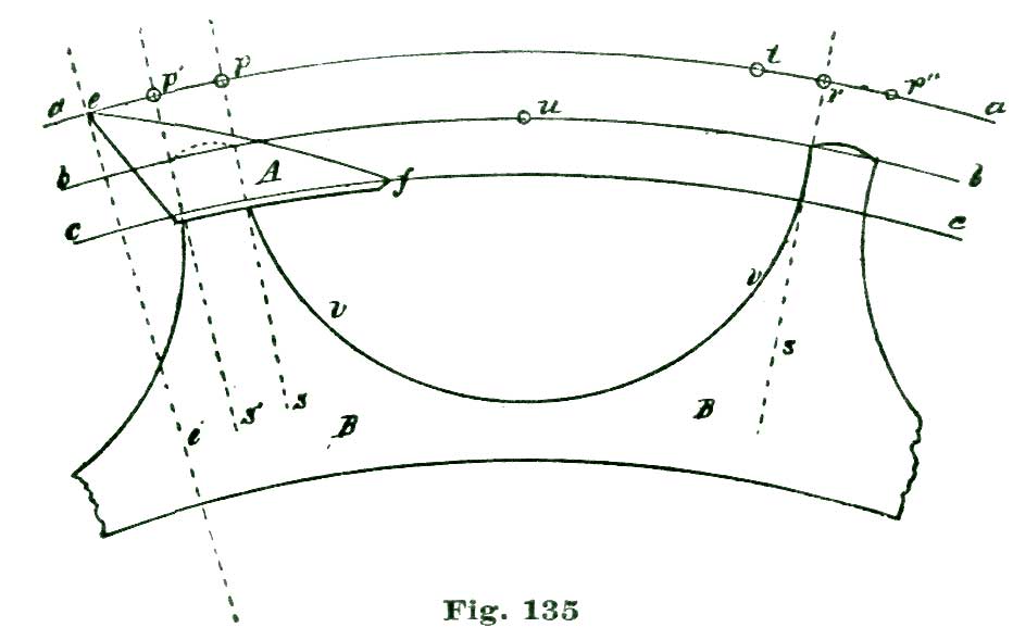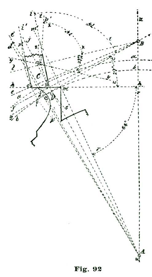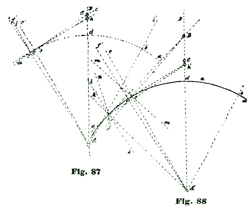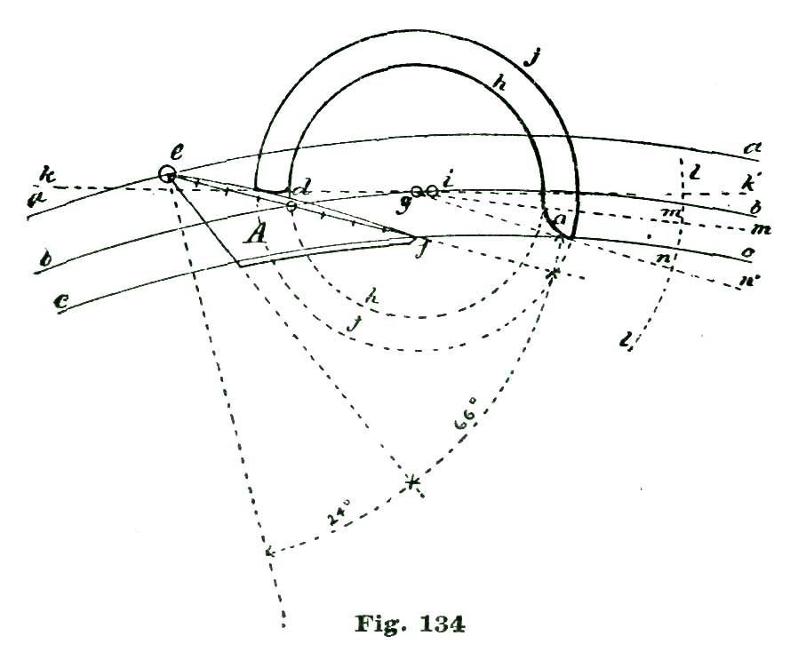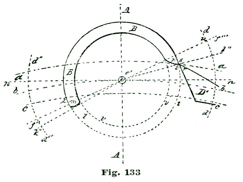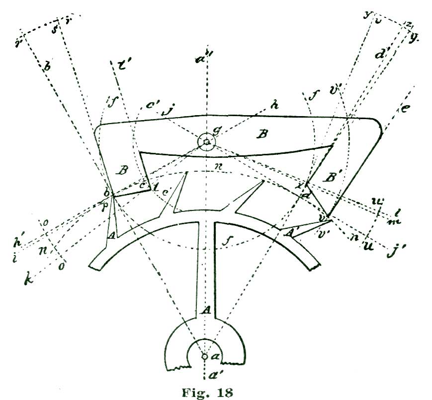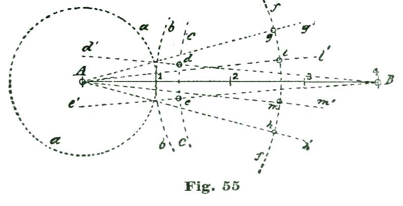 We again lay off two and a half degrees from the intersection of the line A b with the arc a, but this time to the right of said intersection, and through the point so established, and from B as a center, we sweep the arc e. From the intersection of the radial line A g with the arc a we lay off to the left five and a half degrees on said arc, and through the point so established draw the radial line A f. With the dividers set at five inches we sweep the short arc m from B as a center. From the intersection of the line h B h' with the arc m we lay off on said arc and above the line h' four and a half degrees, and through the point so established draw the line B j.