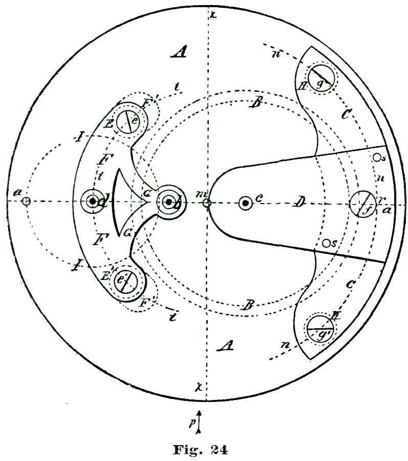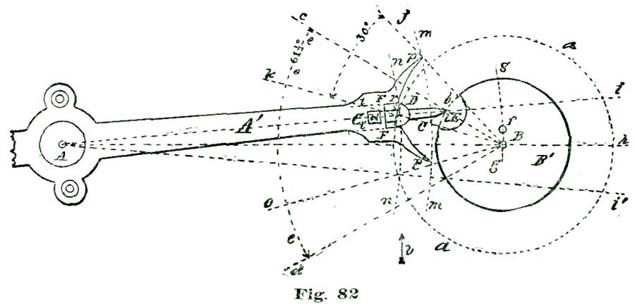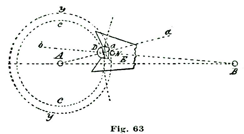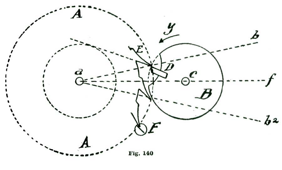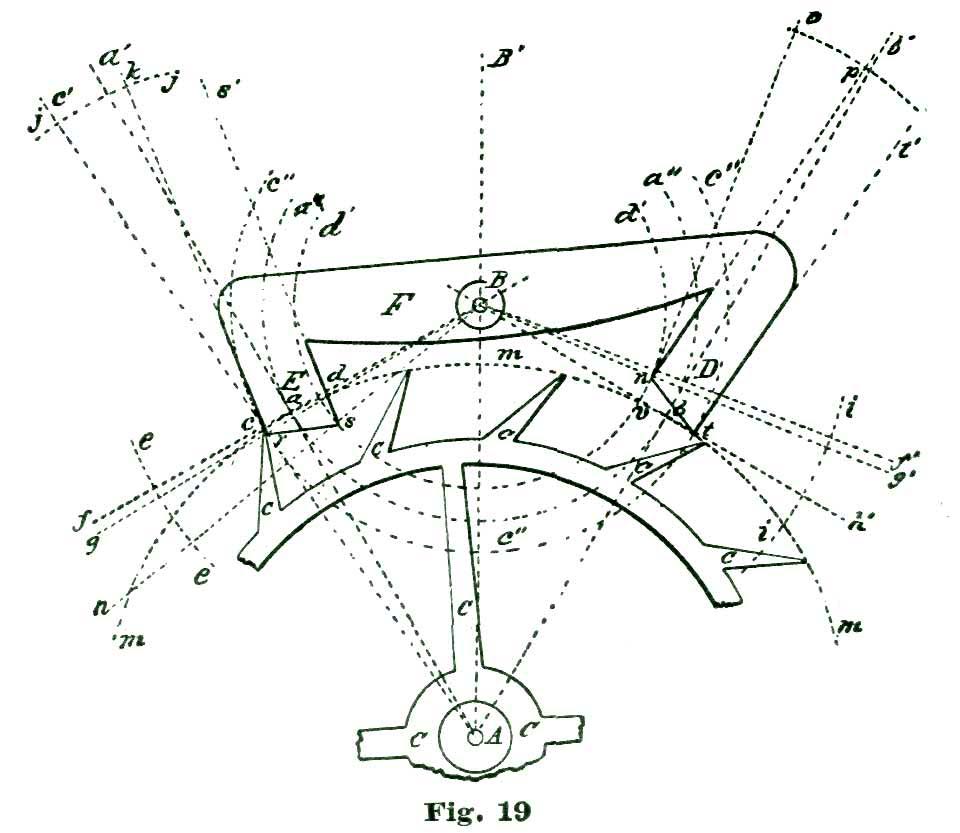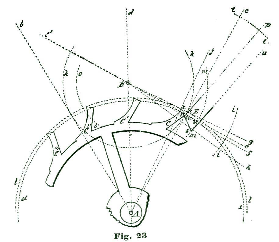 We will not discuss these minor points further at present, but leave them for subsequent consideration. We will say, however, that we could locate the center of the pallet action at the small circle B' above the center B, which we have selected as our fork-and-pallet action, and secure a perfectly sound escapement, with several claimed advantages.