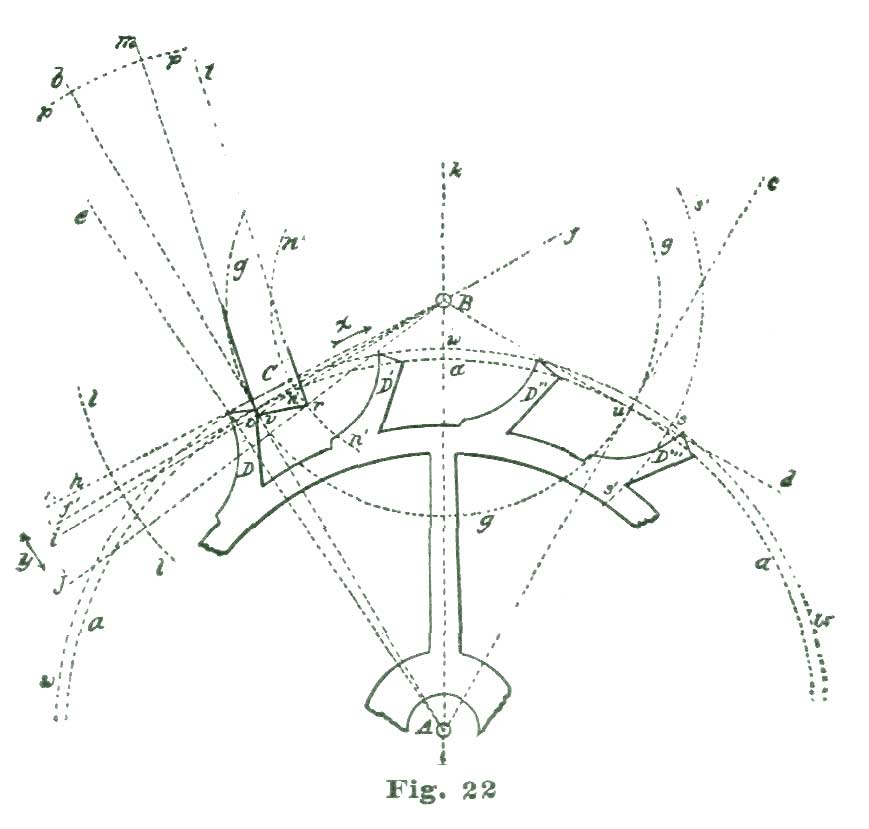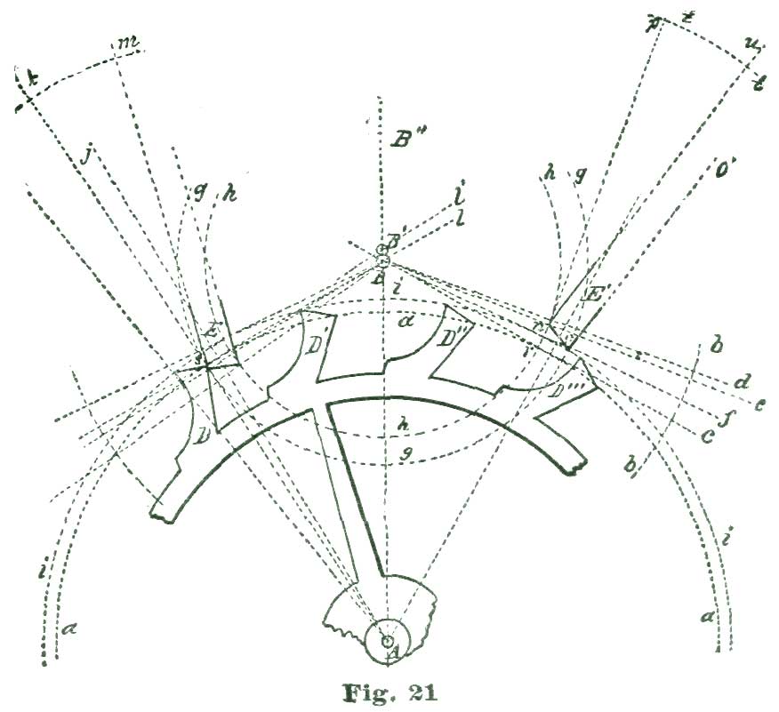 In the drawing shown at Fig. 20 the radius of this curve was obtained by taking eleven and a half degrees from the degree arc of 5" radius in the dividers, and setting one leg at the intersection of the radial line A f with the arc i, and placing the other on the line i, and allowing the point so established to serve as a center, the arc was swept for the back of the tooth, the small circle at n denoting one of the centers just described. The length for the face of the tooth was obtained by taking eleven degrees from the degree arc just referred to and laying that space off on the line p, which defined the face of the tooth. The line B k is laid off one and a half degrees below B h on the arc m. The extent of this arc on the arc d defines the locking face of the entrance pallet. We set off four degrees on the arc m below the line B k, and through the point so established draw the line B l. We draw a line from the intersection of the line A g with the line c h to the intersection of the arc e with the line c l, and define the impulse face of the entrance pallet.