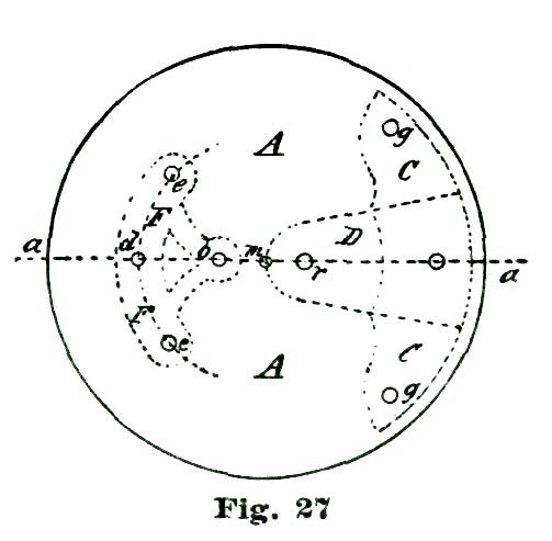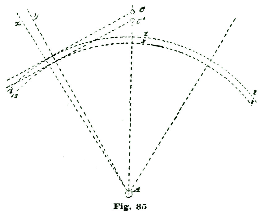 For locating the inner angle of the exit pallet, we measure on the arc d', from its intersection with the peripheral line m, eight and a half degrees, and establish the point n, which locates the position of this inner angle; and, of course, one and a half degrees added on the arc d' indicates the extent of the lock on this pallet. Such drawings not only enable us to theorize to extreme exactness, but also give us proportionate measurements, which can be carried into actual construction.